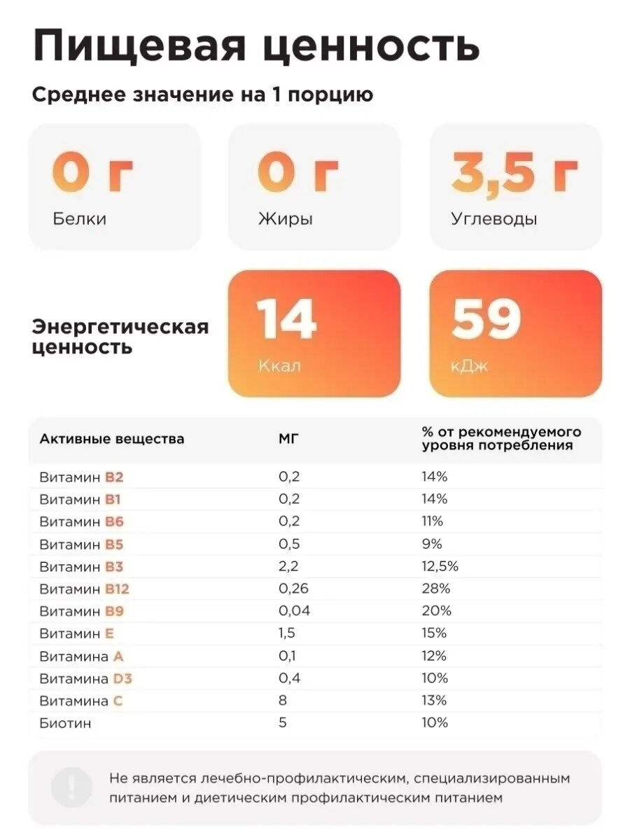 | Состав | екстроза; лимонная кислота; таурин; порошок красных арктических водорослей Lithothamnion sp; комплекс витаминов С, Е, А, Д3, Н, В1, В2, В3, В5, В6, В9, В12; лактоза; сукралоза; ароматизатор пищевой; кармин |