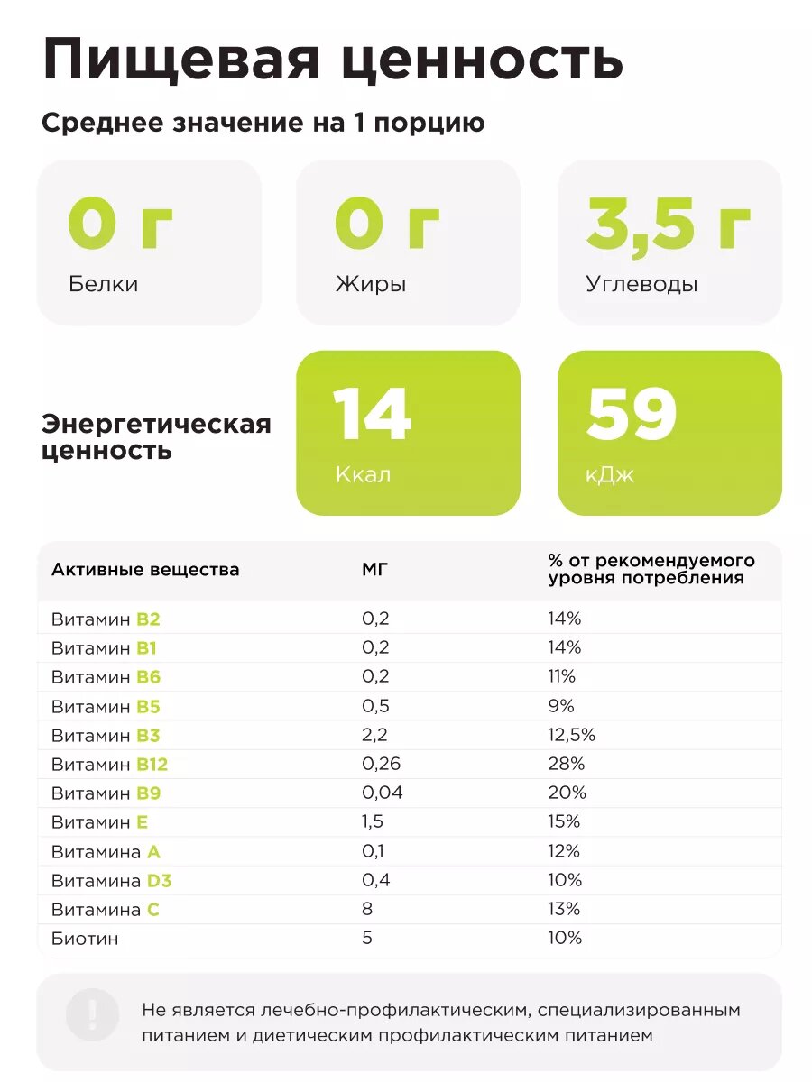 | Состав | екстроза; лимонная кислота; таурин; порошок красных арктических водорослей Lithothamnion sp; комплекс витаминов С, Е, А, Д3, Н, В1, В2, В3, В5, В6, В9, В12; лактоза; сукралоза; ароматизатор пищевой; кармин |