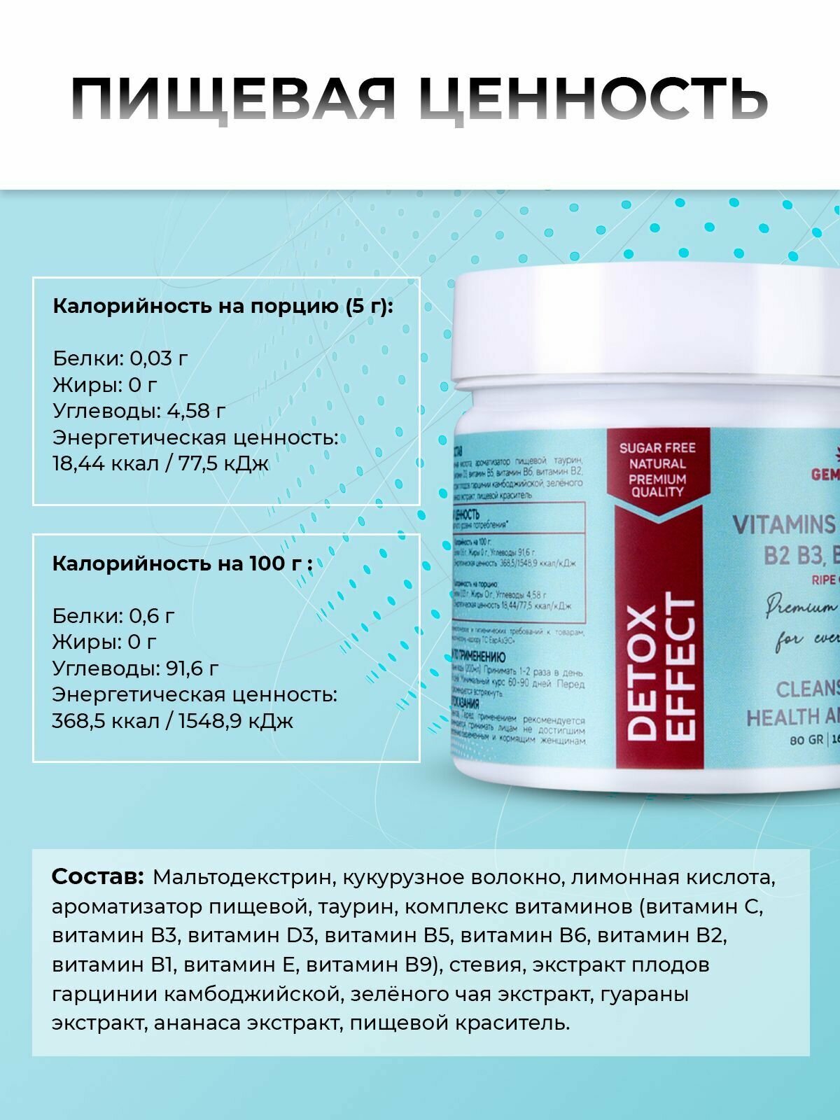 | Состав | Мальтодекстрин, кукурузное волокно, лимонная кислота, ароматизатор пищевой, таурин, комплекс витаминов (витамин С, витамин В3, витамин D3, витамин В5, витамин В6, витамин В2, витамин В1, витамин Е, витамин В9), стевия, экстракт плодов гарцинии камбоджийской, зелёного чая экстракт, гуараны экстракт, ананаса экстракт, пищевой краситель. |