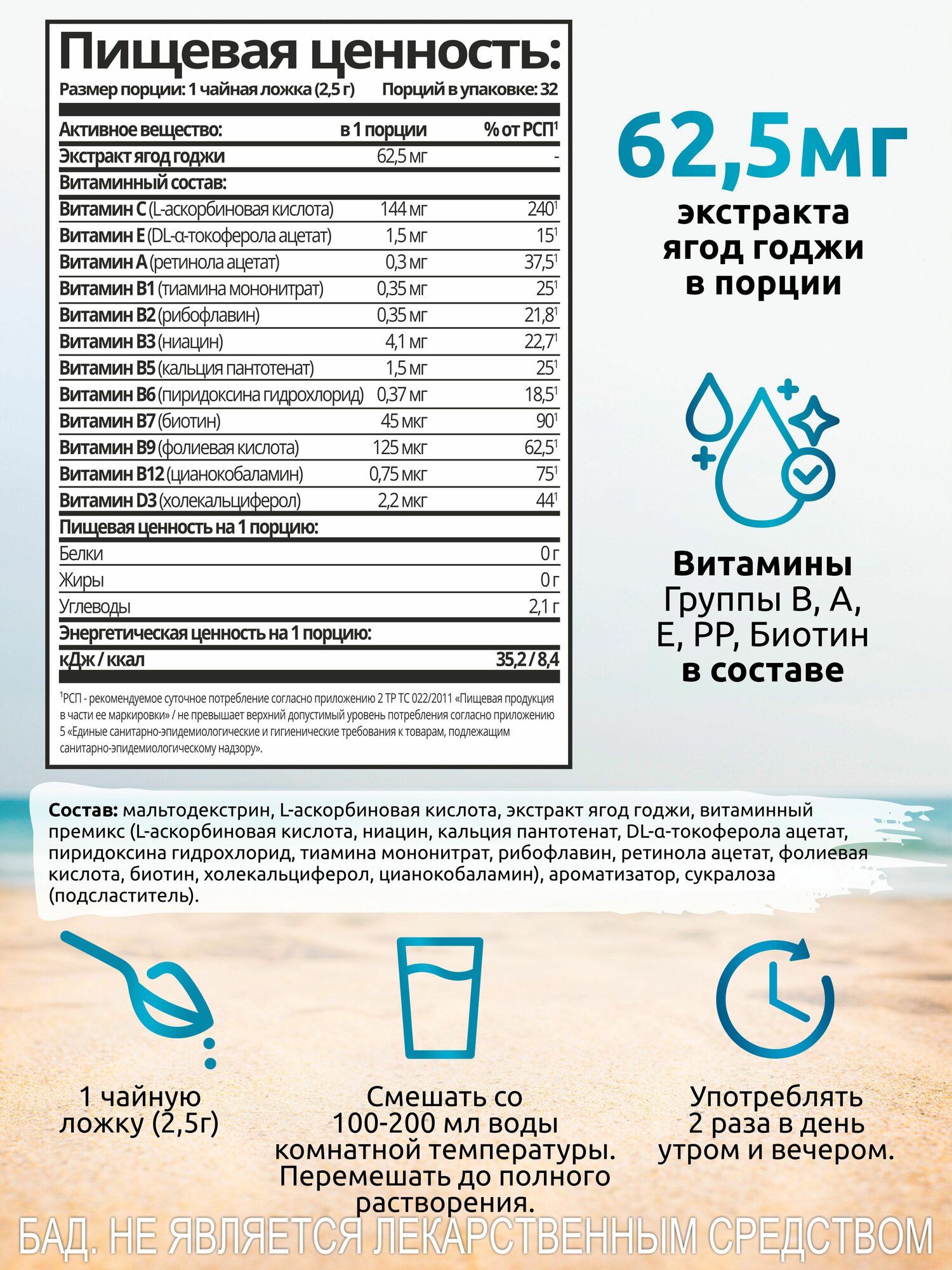 | Состав | мальтодекстрин, L-аскорбиновая кислота, премикс витаминный (биотин (витамин В7), аскорбиновая кислота (витамин С), никотиновая кислота (витамин В3), токоферол (витамин Е), пантотеновая кислота (витамин В5), цианокобаламин (витамин В12), пиридоксин (витамин В6), тиамин (витамин В1), ретинол (витамин А), рибофлавин (витамин В2), кальциферол (витамин D3), экстракт ягод годжи, ароматизатор, сукралоза. |