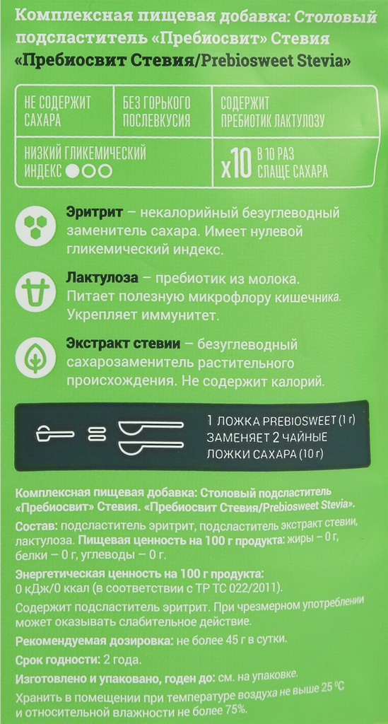 | Состав | эритрит, лактулоза, экстракт стевии |