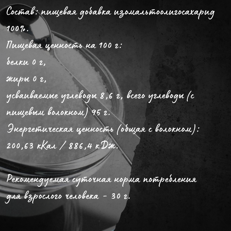 | Состав | Изомальтоолигосахарид (порошок). Содержание ИМО 90,4% |