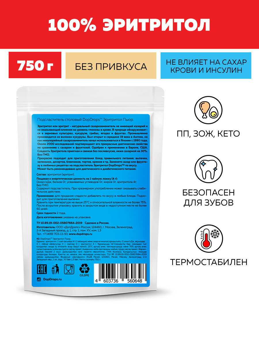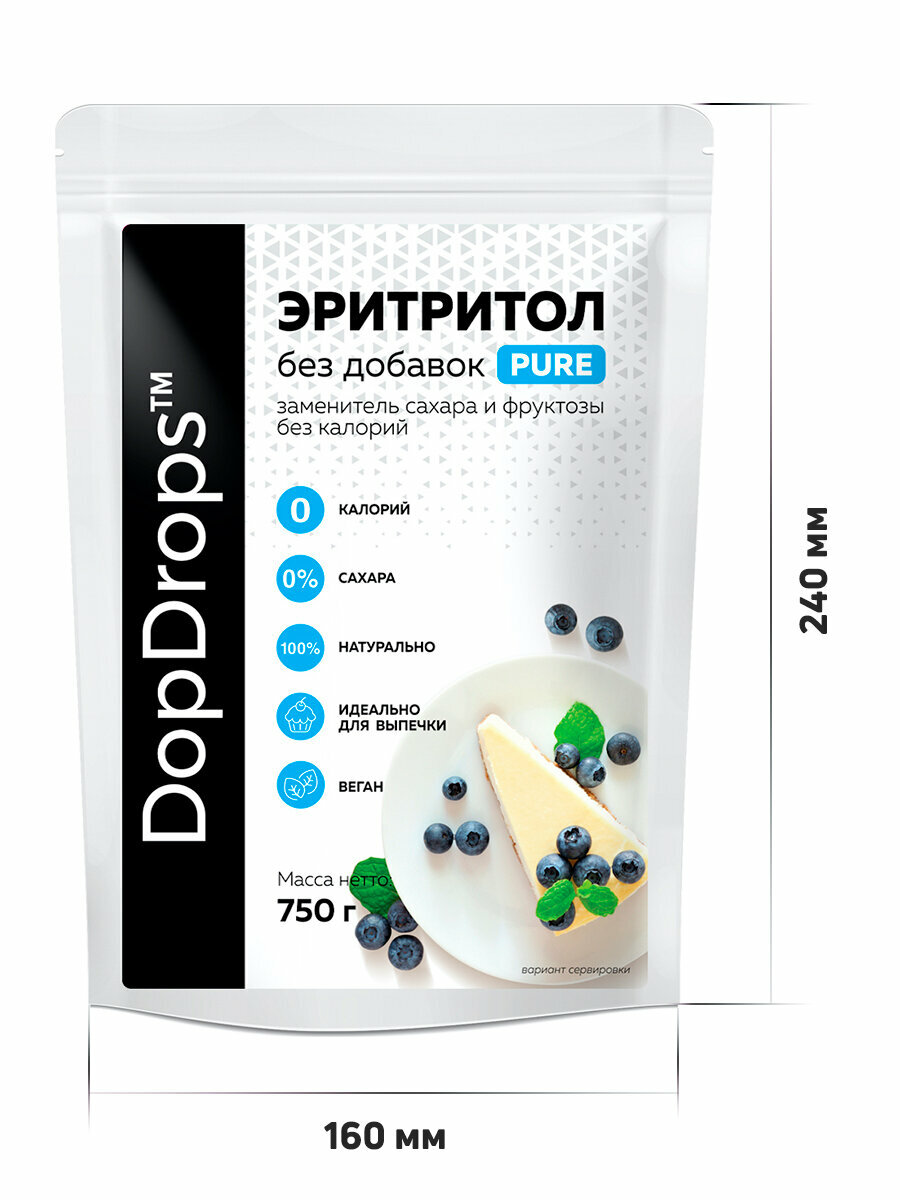 Натуральный сахарозаменитель DopDrops Эритритол (Эритрит) PURE, 70% от сладости сахара, 750 г