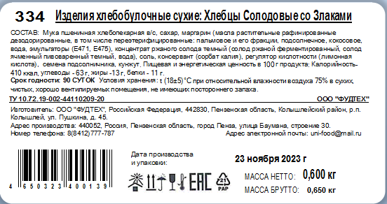 | Стандарты производства | СОСТАВ: Мука пшеничная хлебопекарная в/с, сахар, маргарин (масла растительные рафинированные дезодорированные, в том числе переэтерифицированные: пальмовое и его фракции, подсолнечное, кокосовое, вода, эмульгаторы (Е471, Е475), концентрат ржаного солода темный (солод ржаной ферментированный, солод ячменный пивоваренный темный, вода), соль, консервант (сорбат калия), регулятор кислотности (лимонная кислота), семена подсолничника, кунжут. Пищевая и энергетическая ценность в 100 г продукта: Калорийность- 410 ккал, углеводы - 63 г, жиры -13 г, белки - 11 г. |