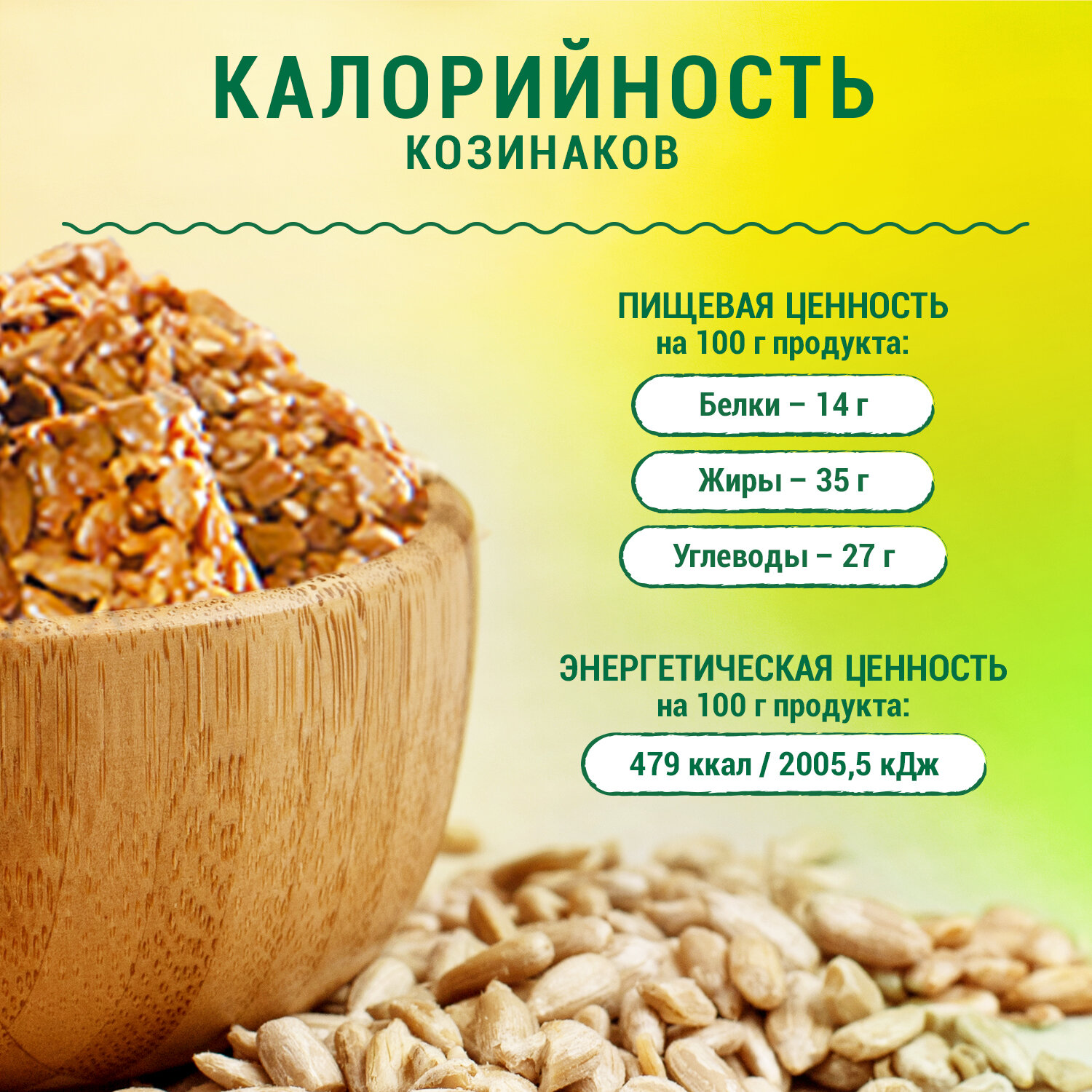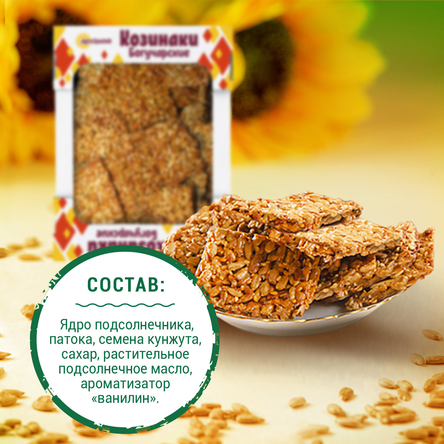 | Состав | Ядро подсолнечника, патока, семена кунжута,сахар, растительное подсолнечное масло , ароматизатор «ванилин». |