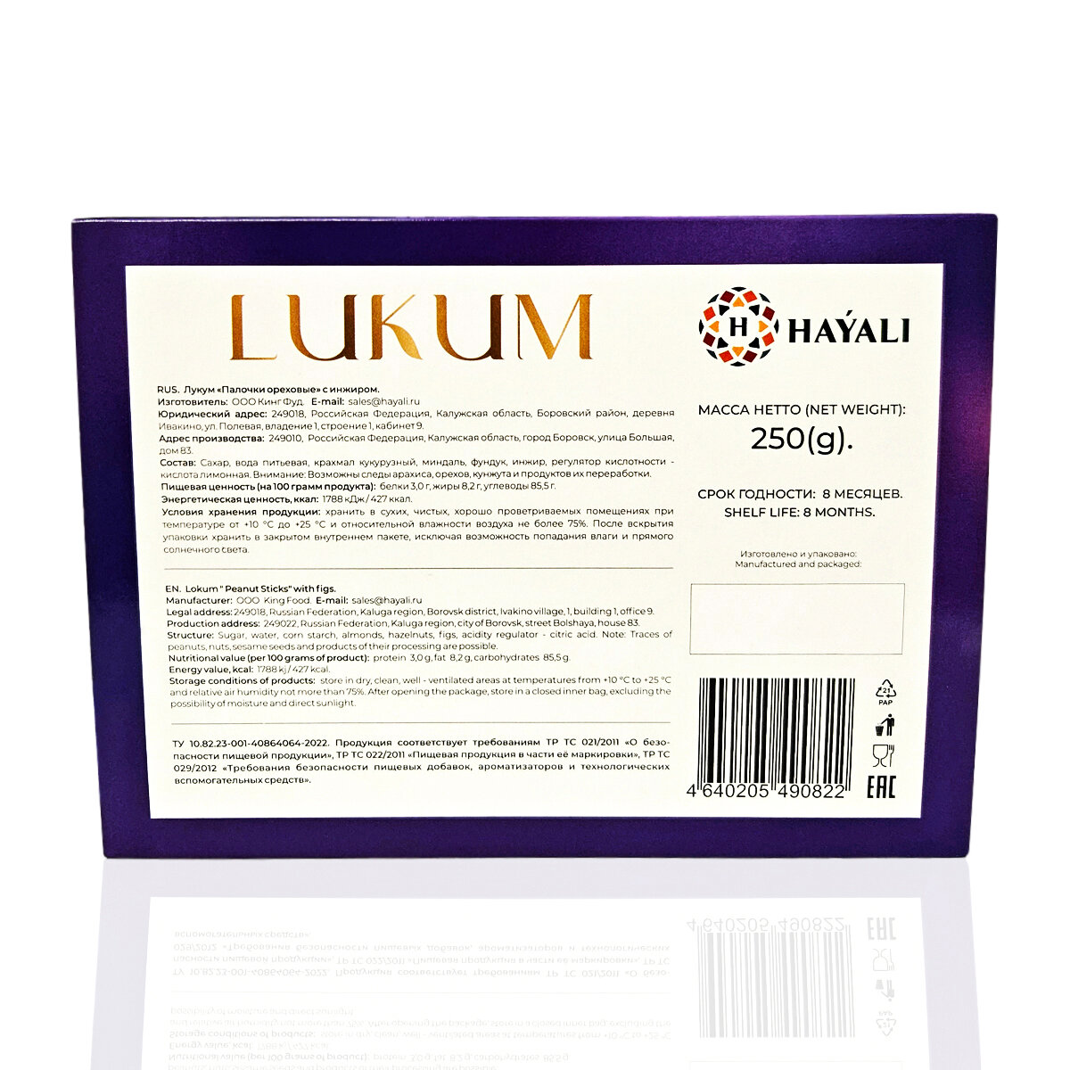 | Состав | Сахар, вода питьевая, крахмал кукурузный, миндаль, фундук, сок фруктовый концентрированный гранатовый, регулятор кислотности-кислота лимонная. |