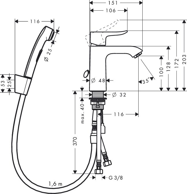 | Комплектация | однорычажный смеситель для раковины / ручной душ бидетте / держатель для душа / шланг для душа / слив/перелив |