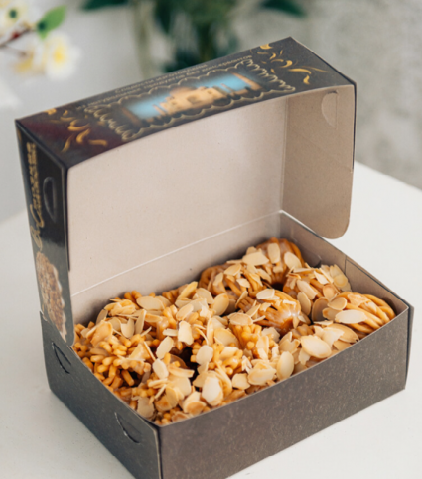 | Состав | обжаренный полуфабрикат (мука пшеничная в/с, вода питьевая, масло подсолнечное, сахар песок, кислота лимонная, разрыхлитель (сода пищевая), соль), медово-сахарный сироп (мед натуральный, сахар-песок), миндальные лепестки. |