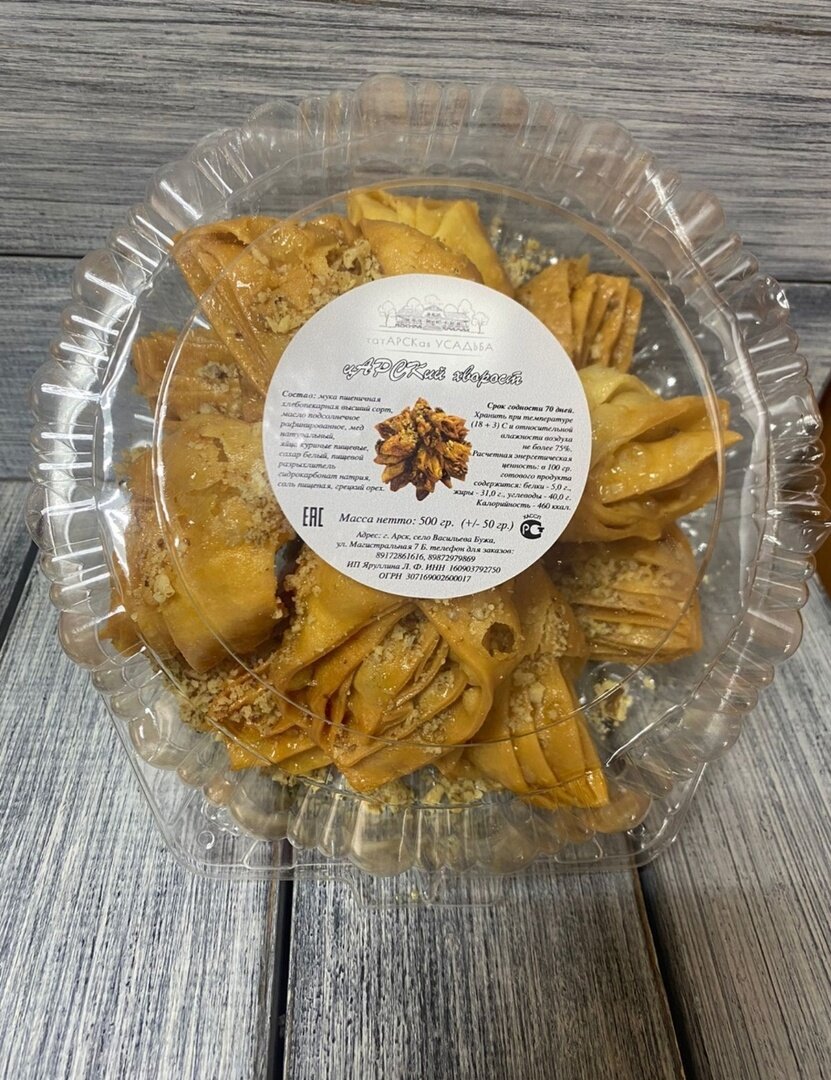 | Состав | мука пшеничная хлебопекарная высший сорт, масло подсолнечное рафинированное, мёд натуральный, яйца куриные пищевые, сахар белый, пищевой разрыхлитель, гидрокарбонат натрия, соль пищевая, грецкий орех. |