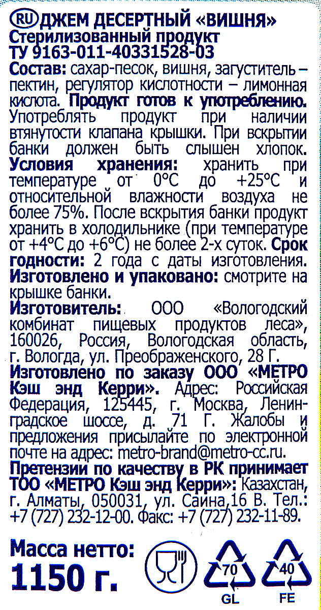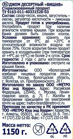 Джем Metro Chef вишневый 1,15 кг интересное: