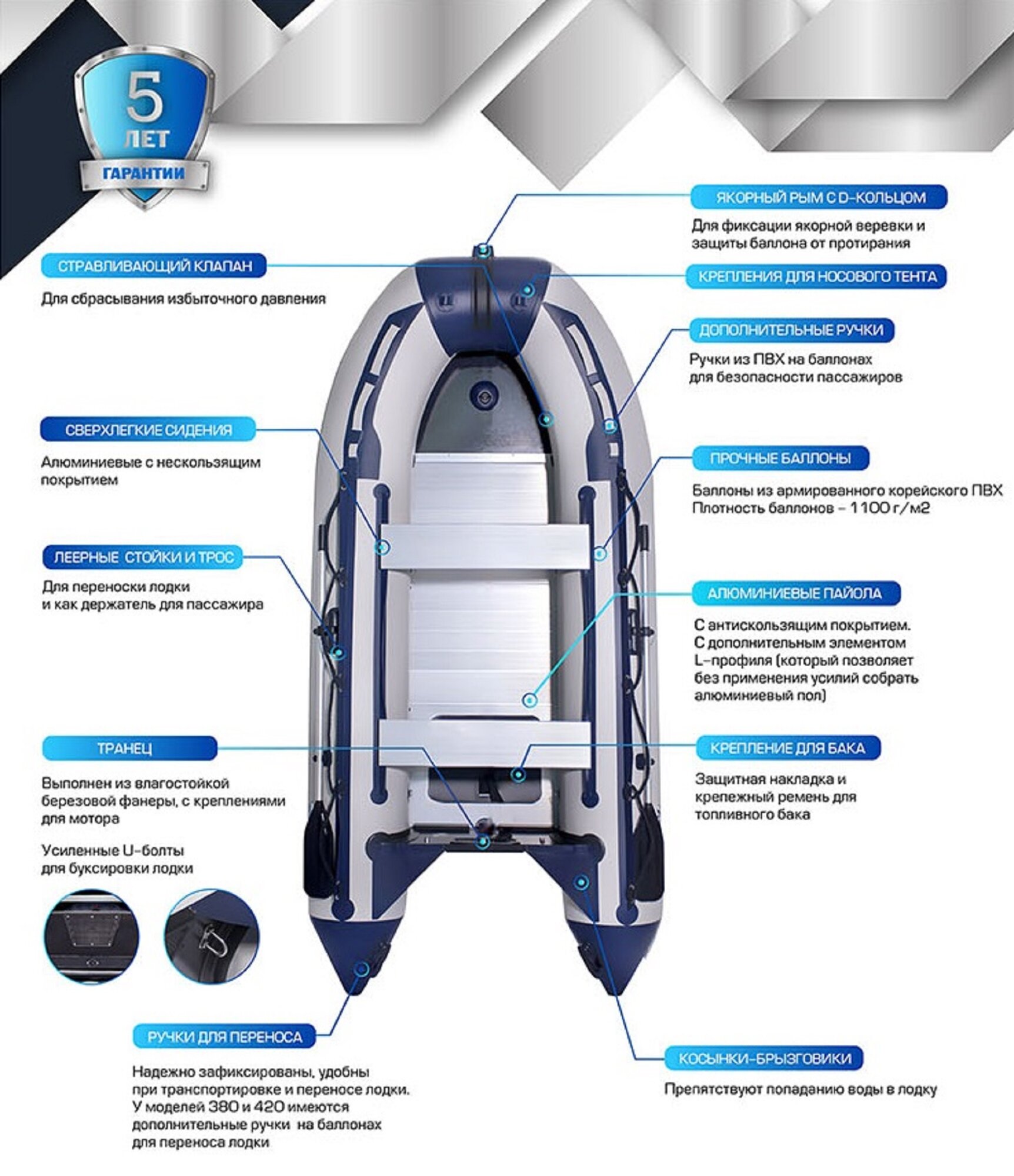 | Комплектация | весла, жесткое сиденье, киль жесткий, клапан для слива воды, леерный трос, насос, привальный брус, разборный пайол, ремкомплект, ручки для переноски, стрингеры, уключины, якорный рым |