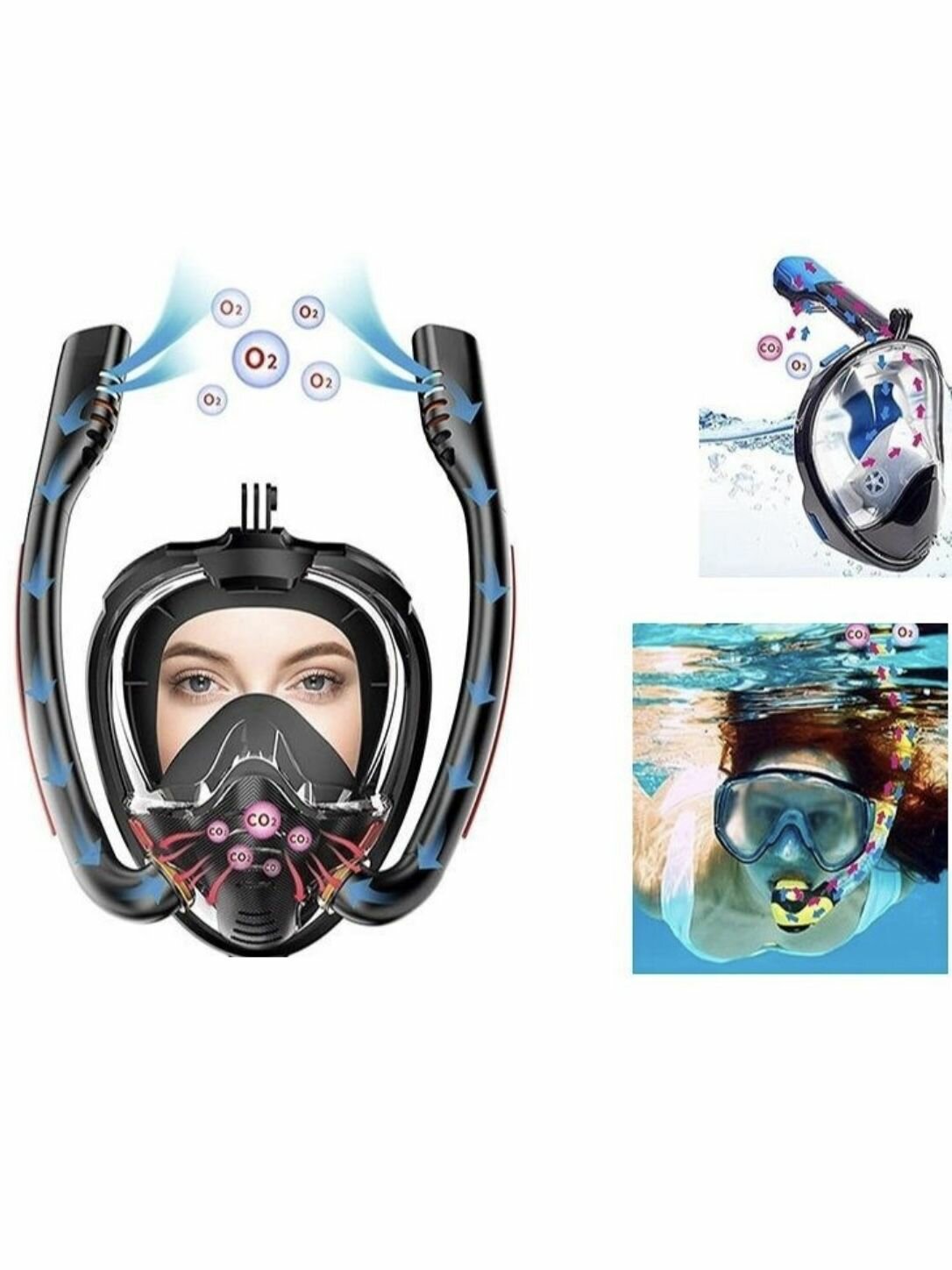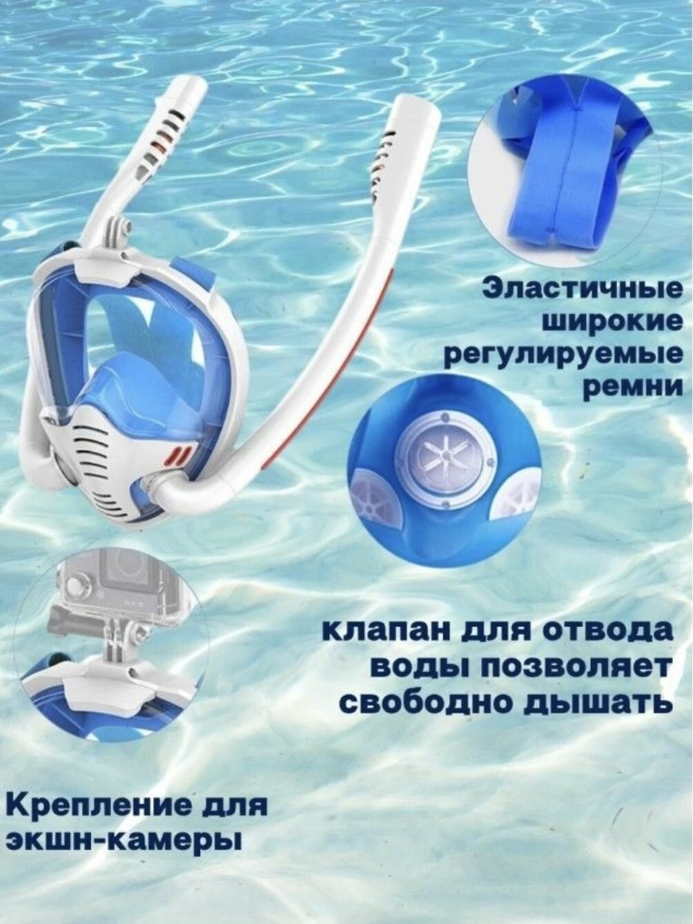 Полнолицевая маска для снорклинга 2 трубки и креплением для экшн камеры. бело-синяя. S/M интересное: