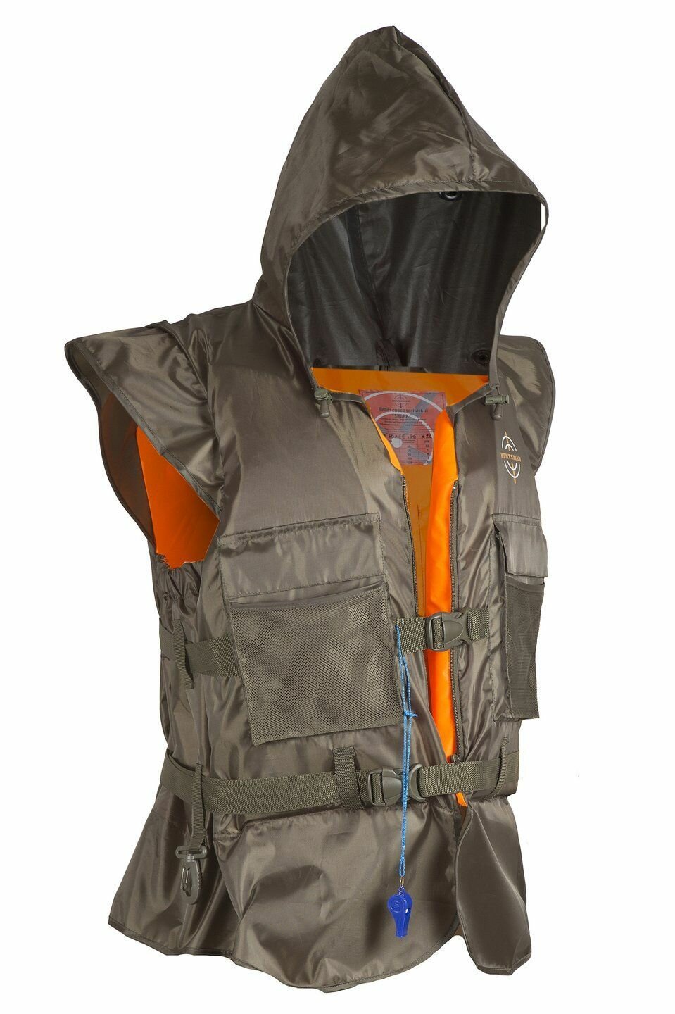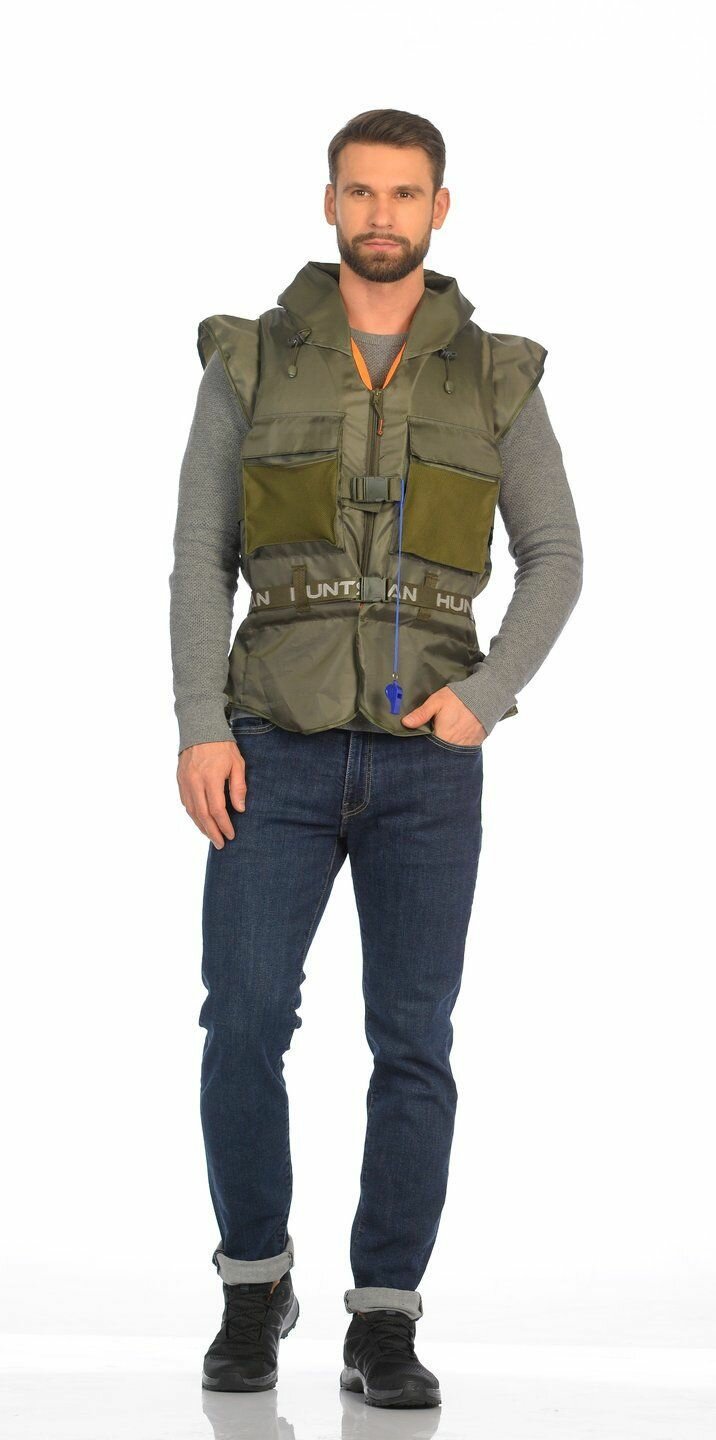 Жилет спасательный Shark с капюшоном, карманами и свистком, цвет Хаки (р.48-52/80 кг)