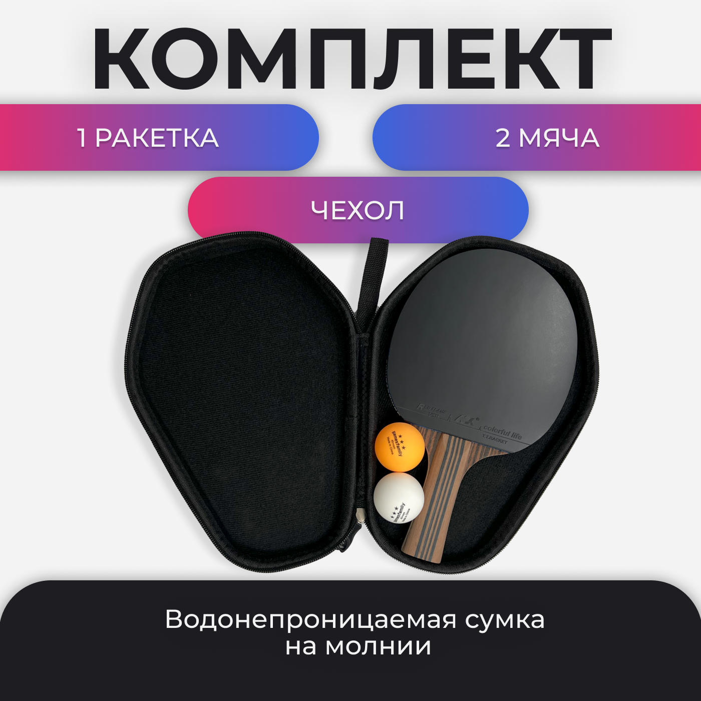 Gamesfamily Набор для настольного тенниса: 2 полупрофессиональных ракетки, 3 белых мячика 40+мм и черная водонепроницаемая сумка-переноска с ручкой на молнии