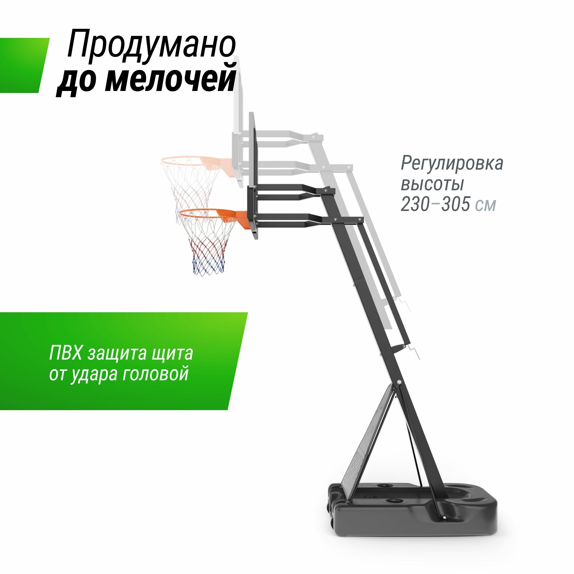 | Подробная комплектация | баскетбольная стойка, всепогодная нейлоновая сетка, щит из поликарбоната с защитной пленкой, стальные трубы стойки, водоналивное основание платформы |