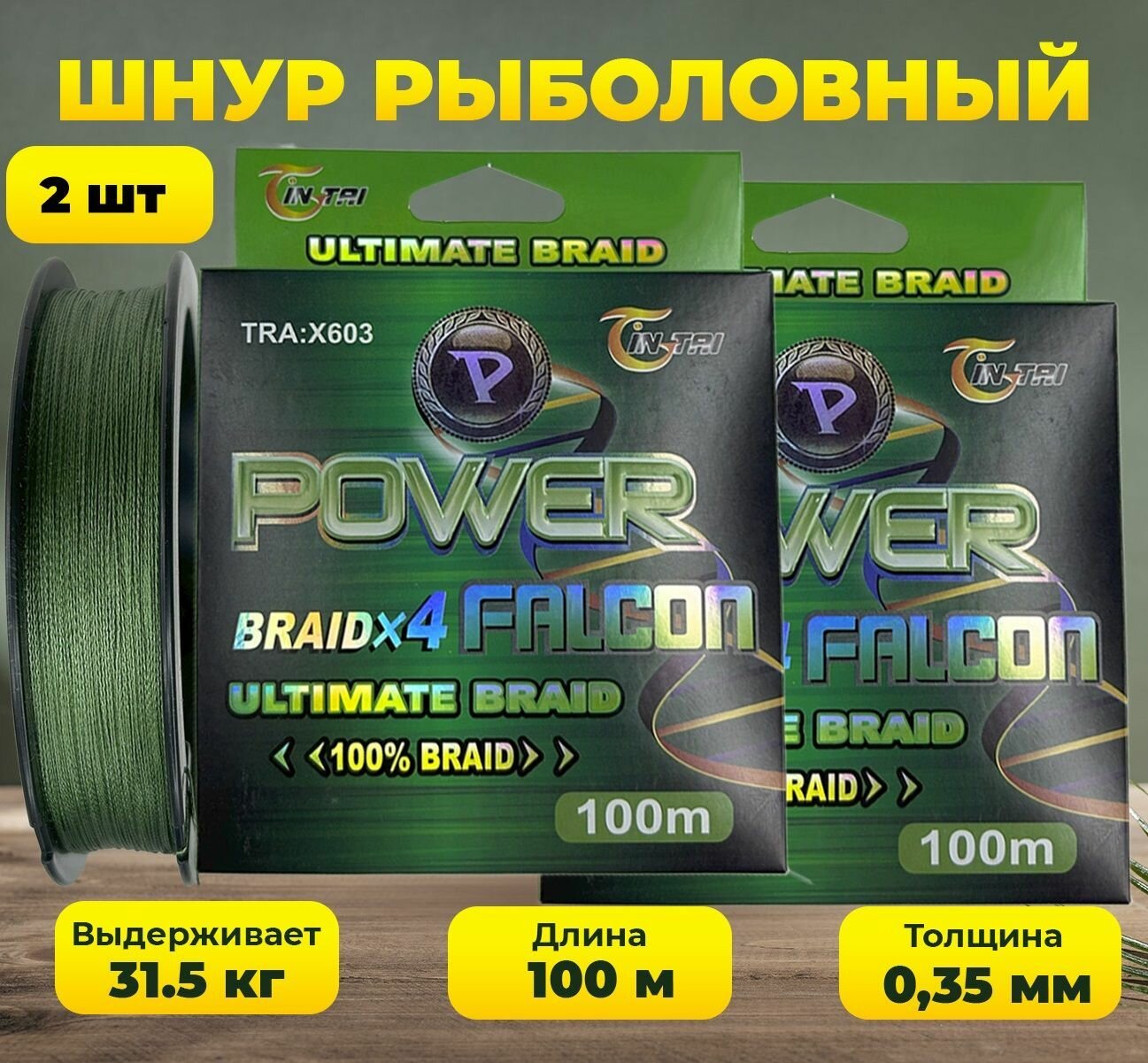 СохранитьШнур для рыбалки 100 метров Power Falcon X4 зеленый 0.35 мм 31.5 кг 2 шт. интересное:
