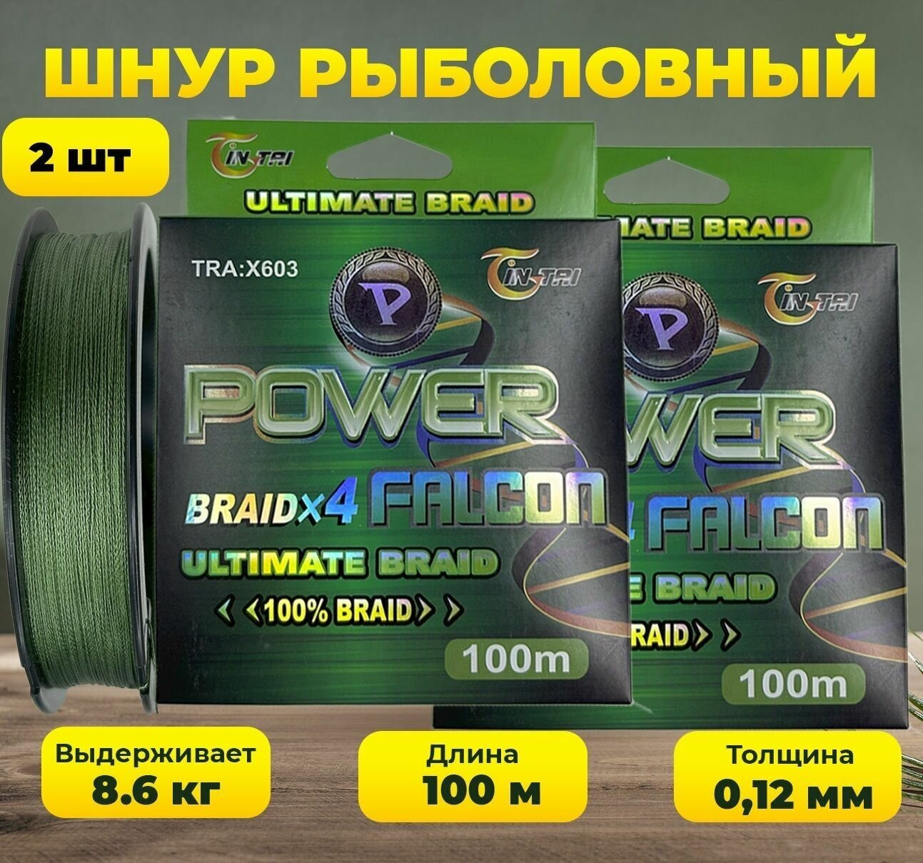Купить Шнур для рыбалки 100 метров Power Falcon X4 зеленый 0.12 мм 8.6 кг 2 шт.