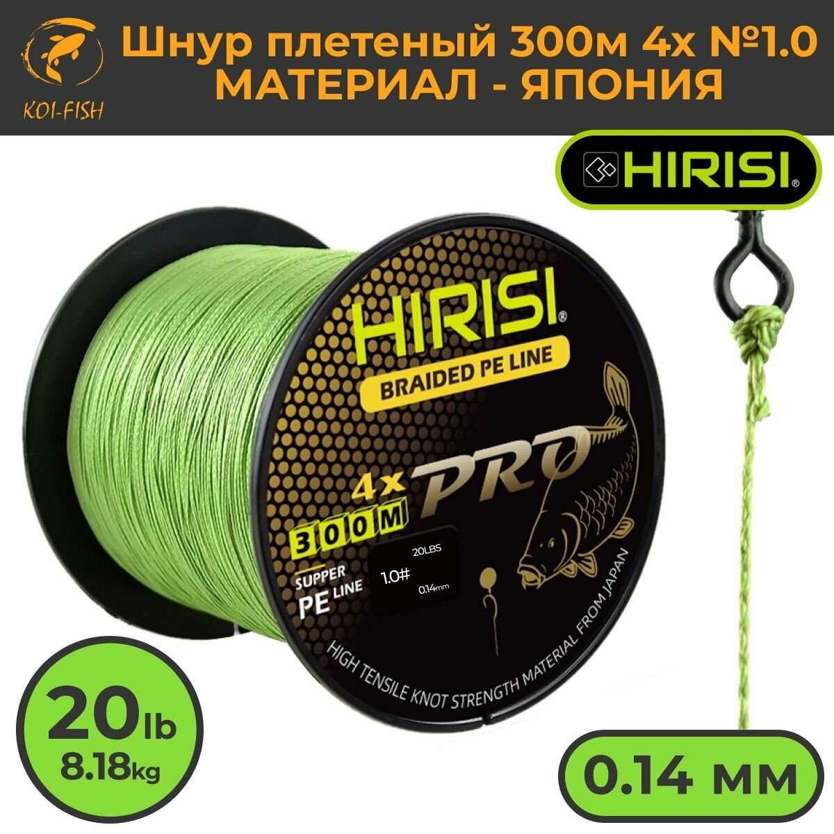 Шнур плетеный HIRISI четырехжильный №2.0 300м 28LB (12,73 кг) (Braided Pe Line №2.0_28LB) зеленый, материал - Япония, шнур рыболовный для ловли карпа