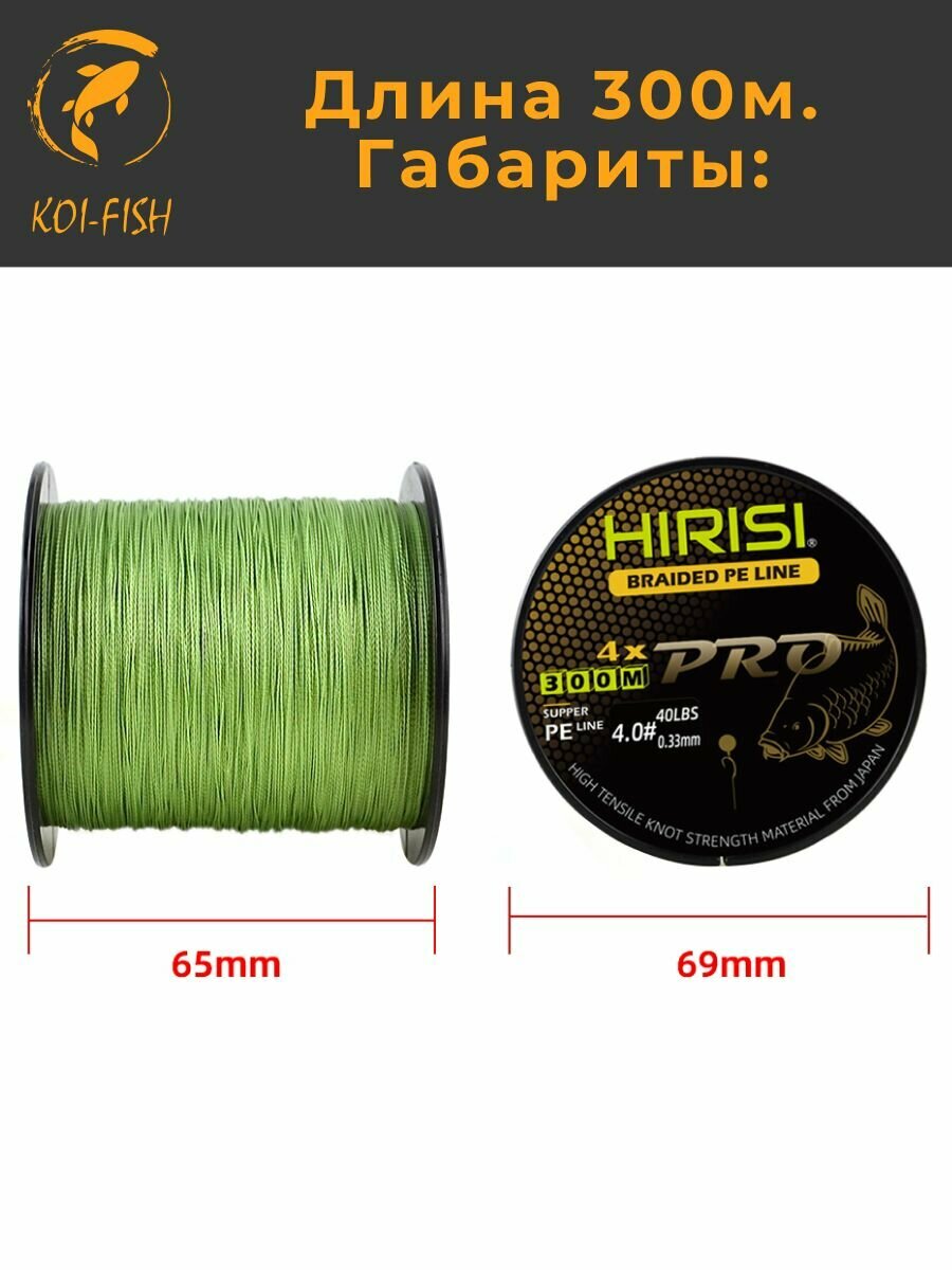 Шнур плетеный HIRISI четырехжильный №4.0 300м 40LB (18,18 кг) (BraidedPeLine №4.0_40LB) зеленый, материал - Япония, шнур рыболовный для ловли карпа