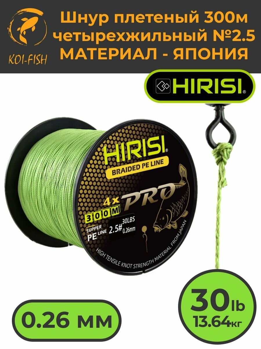 Купить Шнур плетеный HIRISI четырехжильный №2.5 300м 30LB (13,64 кг) (Braided Pe Line №2.5_30LB) зеленый, материал - Япония, шнур рыболовный для ловли карпа