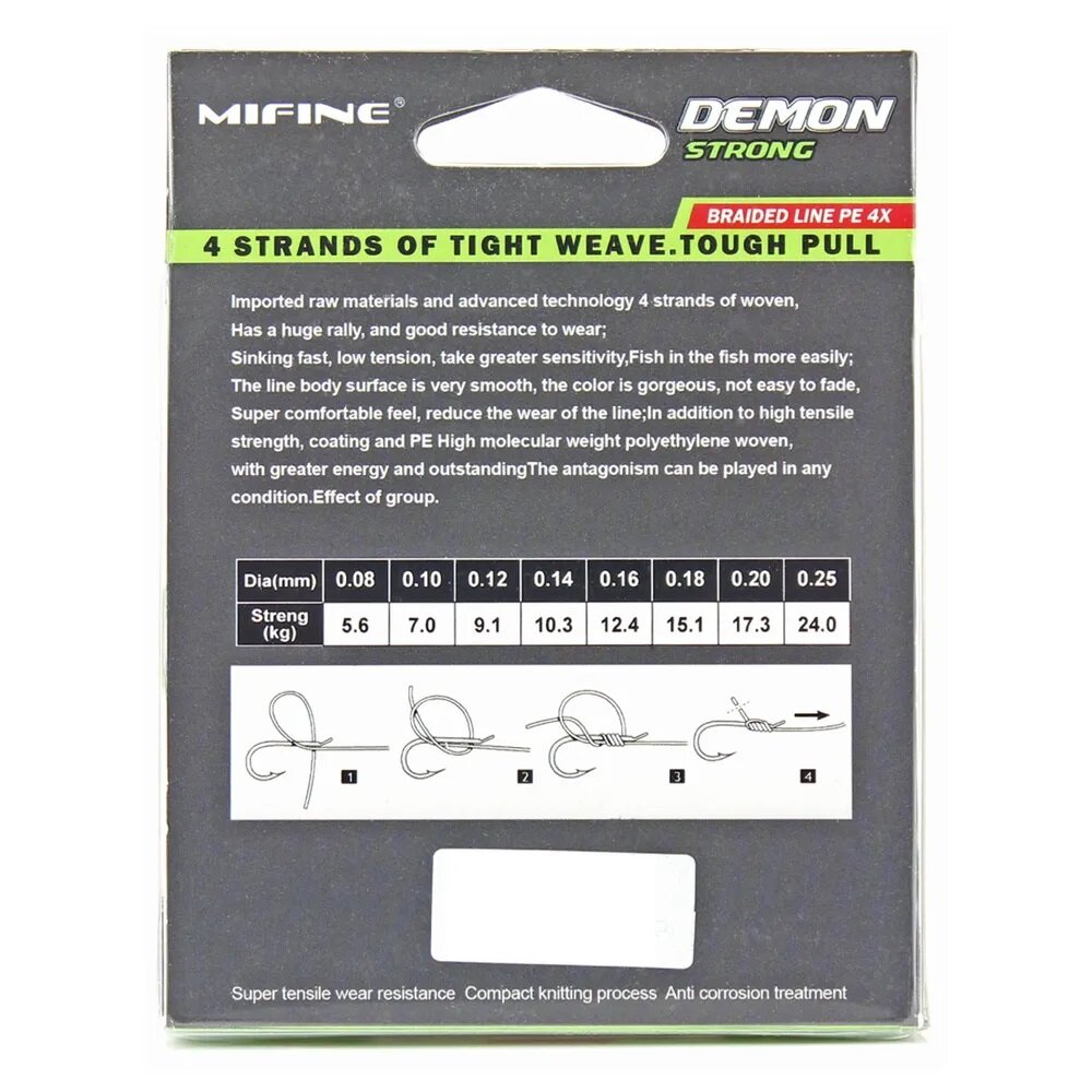 Ниже Вы можете прочитать отзывы на Плетеный шнур для рыбалки MIFINE DEMON STRONG X4PE (300м); (d - 0,18мм); (тест - 15,1кг), ознакомится с подробными характеристиками, посмотреть интересные обзоры и фотографии на Плетеный шнур для рыбалки MIFINE DEMON STRONG X4PE (300м); (d - 0,18мм); (тест - 15,1кг).