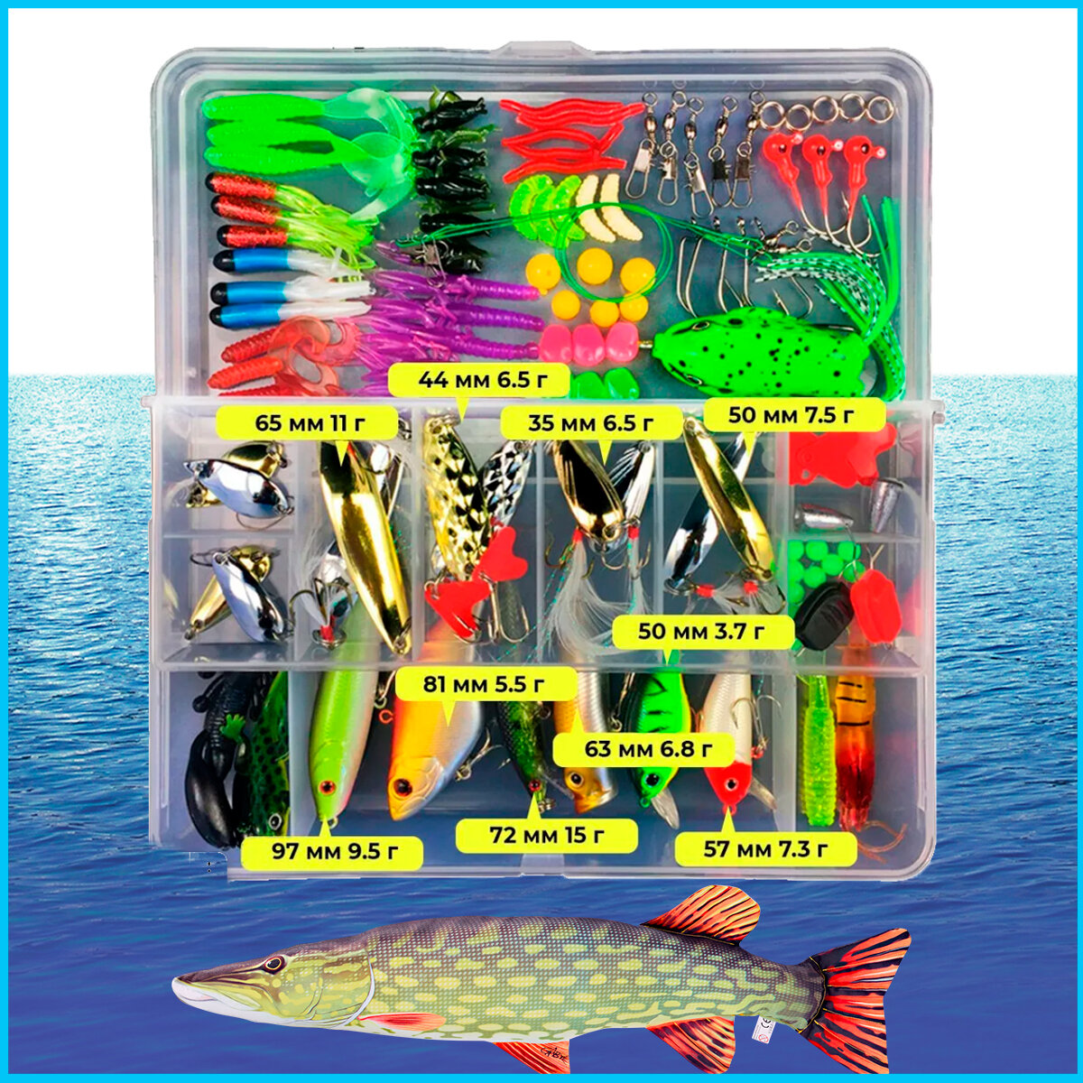 Набор Рыболовных Принадлежностей 106 Предметов: блесна колеблющаяся, воблеры, силиконовые приманки, аксессуары для приманок интересное: