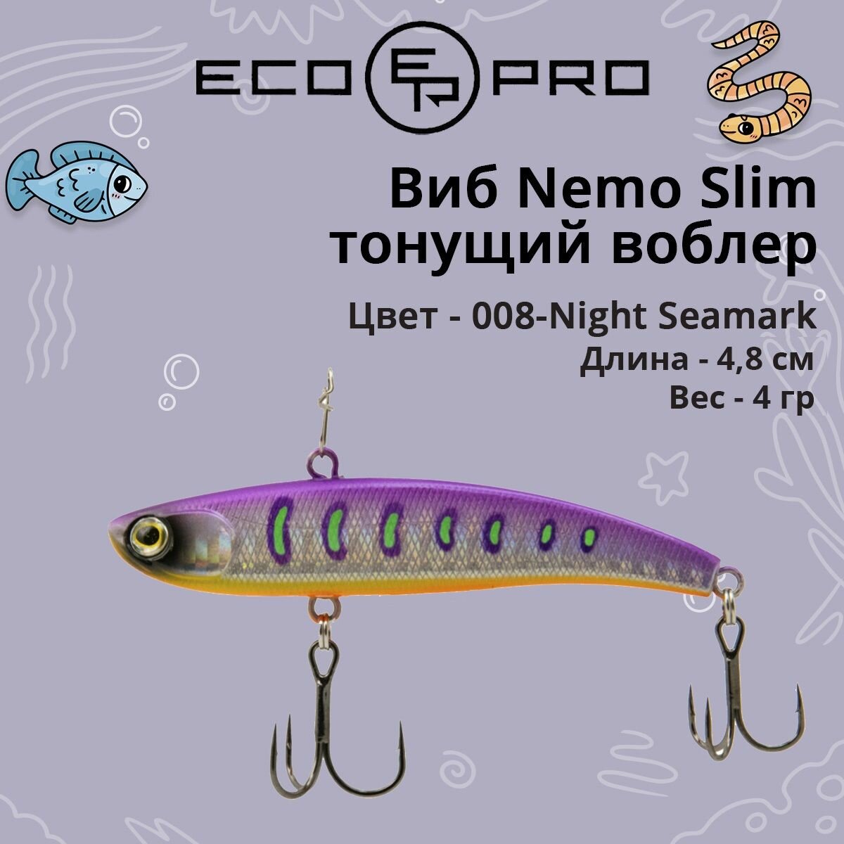 СохранитьВиб (тонущий воблер) для зимней рыбалки ECOPRO Nemo Slim 48мм 4г 008-Night Seamark интересное: