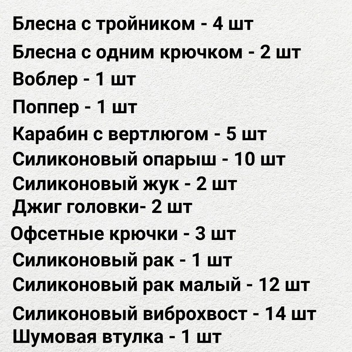 | В наборе | блесна, вертлюг, вертлюг с застежкой, груз, джиг-головка, джиговый груз, кейс, крючок, приманка |
