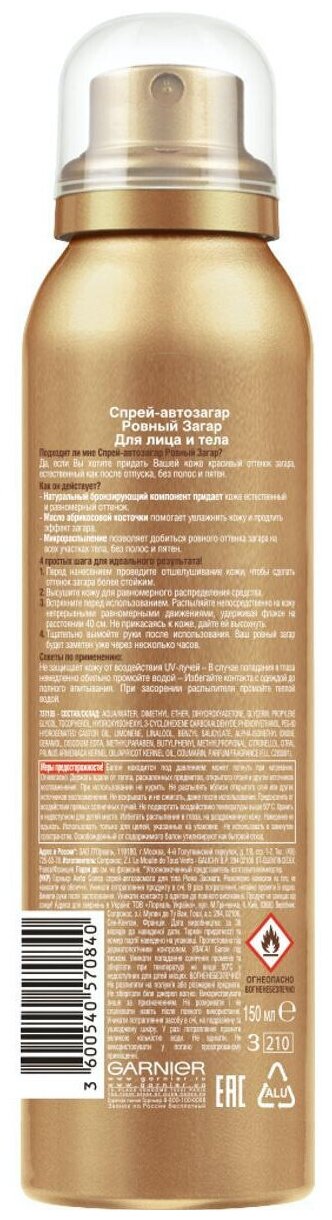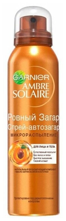 Garnier Спрей-автозагар для тела "Ambre Solaire, Ровный загар", для лица и тела, с маслом абрикосовой косточки, 150 мл