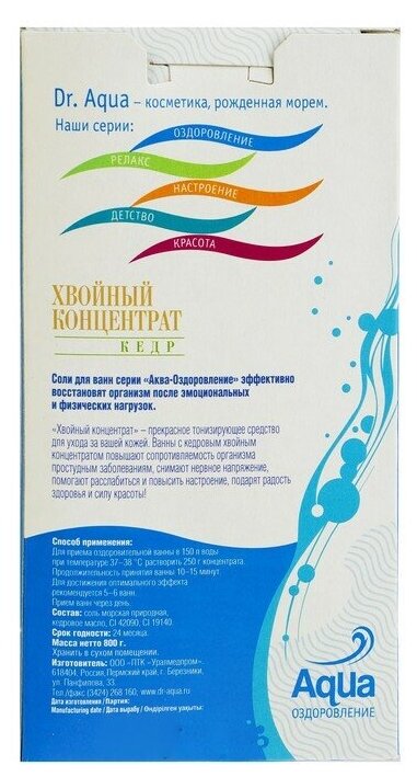 Соли и масла для ванны Уралмедпром Хвойный концентрат Dr.Aqua 800 г кедр (коробка)