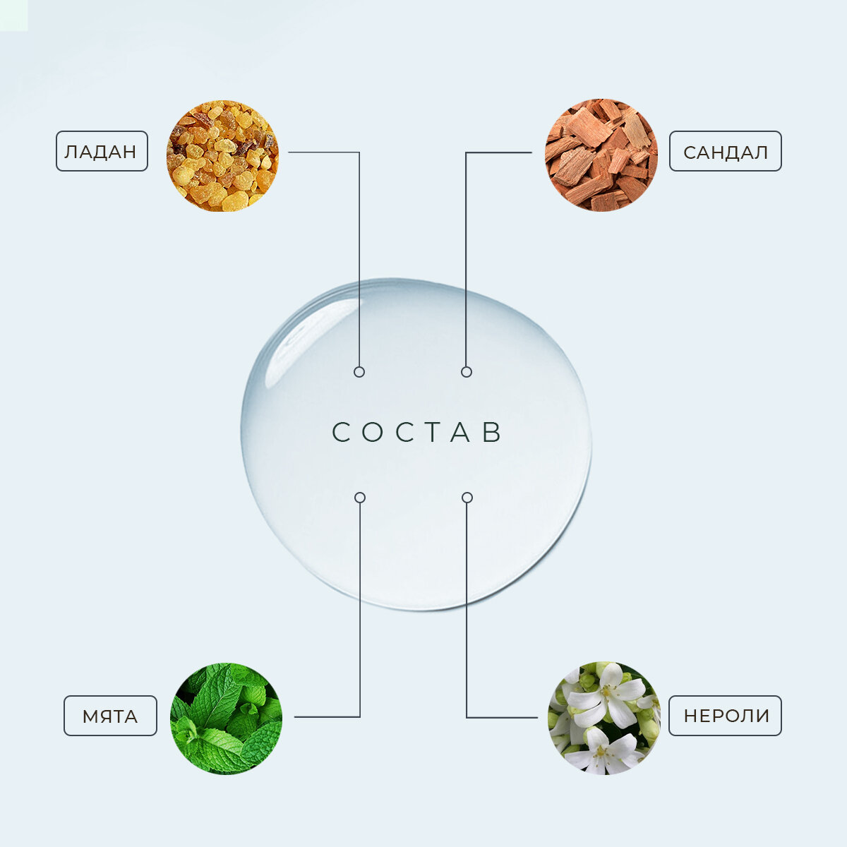 | Состав | 100% эфирные масла эфирные масла Сандала, Нероли, Ладана и Мяты. |
