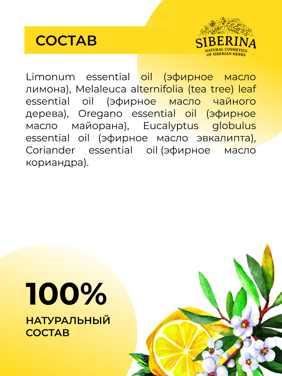 | Состав | Limonum essential oil (эфирное масло лимона), Melaleuca alternifolia (tea tree) leaf essential oil (эфирное масло чайного дерева), Оregano essential oil (эфирное масло майорана), Eucalyptus globulus essential oil (эфирное масло эвкалипта), Coriander essential oil (эфирное масло кориандра). |