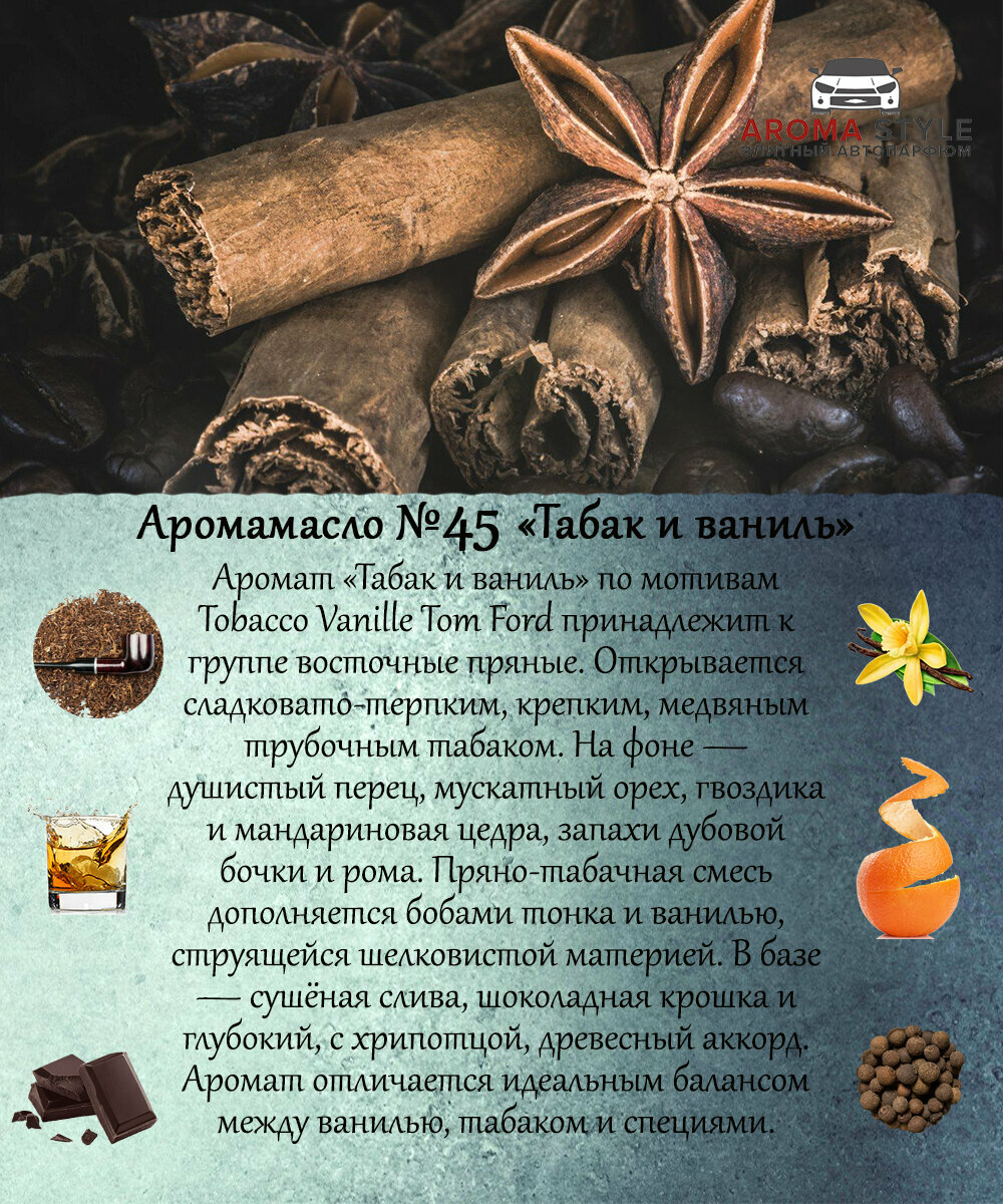 СохранитьАромамасло Tobacco & Vanilla (заправка, эфирное масло, парфюмированная отдушка) №45 интересное:
