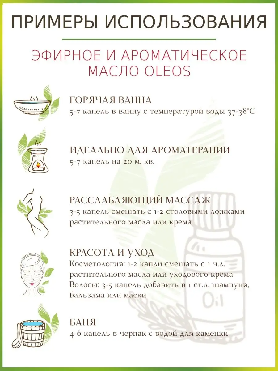 | Способ применения | Массаж. Эфирное масло (3-5 капель) смешать с 1-2 столовыми ложками любого растительного масла (жожоба, персикового, миндального и др.) или массажного крема, нанести на кожу, затем массировать проблемные участки тела в течение нескольких минут до полного впитывания в кожу. Ароматизация воздуха. Аромалампу наполняют горячей водой, капают 5-7 капель эфирного масла в расчете 20м2 площади. В нижнюю часть аромалампы помещают зажжённую свечу. Свеча нагревает воду. Не допускать кипения воды. Длительность процедуры 15-30 минут. |