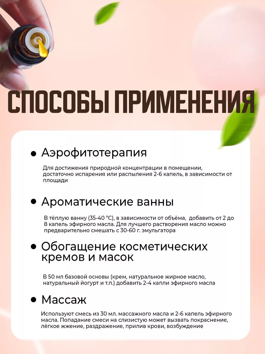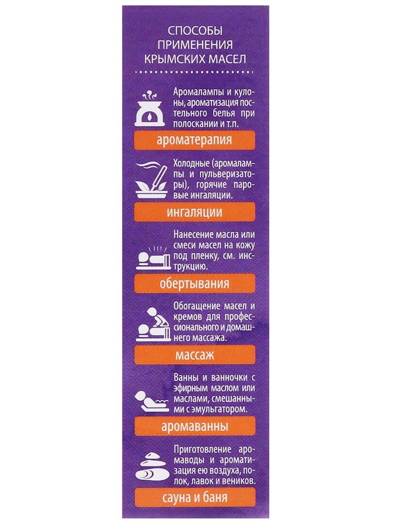| Способ применения | аэрофитотерапия (вдыхание запаха), ароматические ванны, массаж |