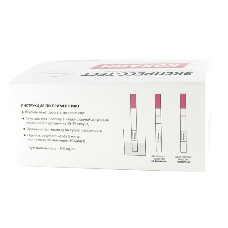 | Дополнительная информация | Определение основано на принципе конкурентного иммунохроматографического анализа, при котором котинин, находящийся в анализируемом образце, конкурирует с котинином, иммобилизованным на мембране полоски, за возможность связывания со специфическими моноклональными антителами к котинину, конъюгированными с коллоидным золотом, препятствуя образованию розово-фиолетовой линии в нижней части тестовой зоны. Остальные реагенты обеспечивают образование розово-фиолетовой линии контроля в верхней части тестовой зоны независимо от присутствия котинина, что подтверждает правильность проведения процедуры определения. Если концентрация котинина в образце выше или равна пороговой (200 нг/мл), в тестовой зоне образуется одна линия розово-фиолетового цвета, а если котинин отсутствует или его концентрация ниже пороговой – две линии. |