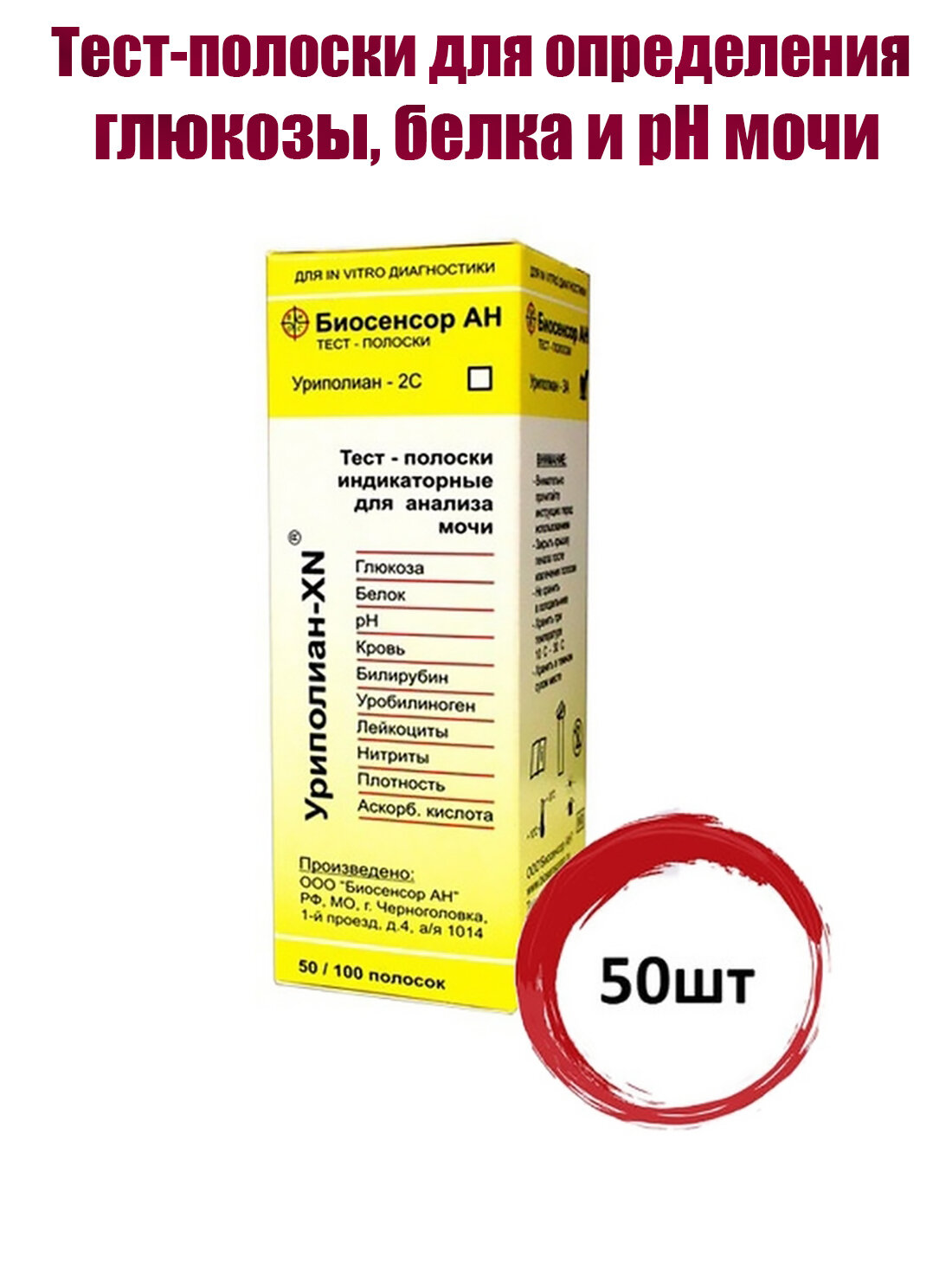 Урополиан-2А тест-полоски для определения глюкозы, белка и рН мочи, 50шт