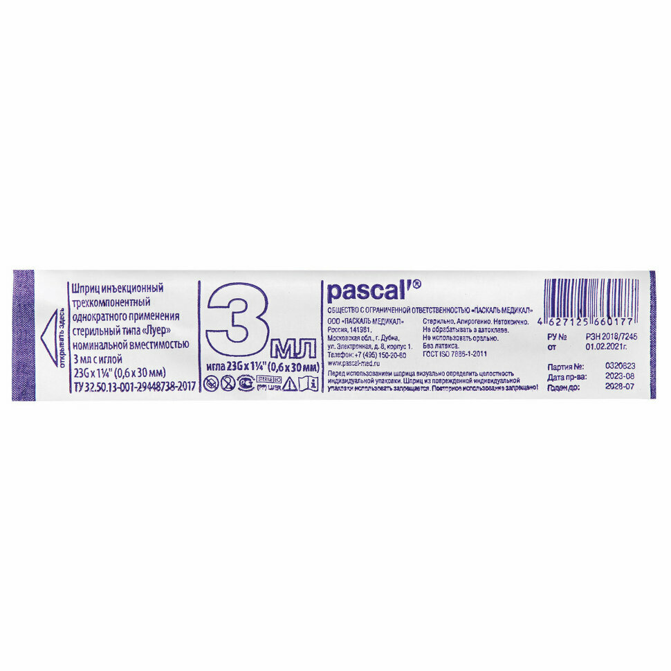 Купить Шприц 3-х компонентный Pascal 3 мл с иглой 23G (0,6х30 мм) 100 шт