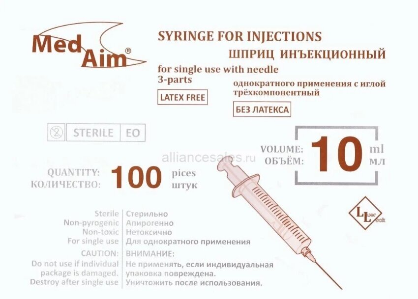 Купить Шприц инъекционный 3-х компонентный MedAim Luer Lock 10 мл с иглой 0,8х40 (21Gх1 1/2") Луер Лок MEDAIM, 100 шт/уп