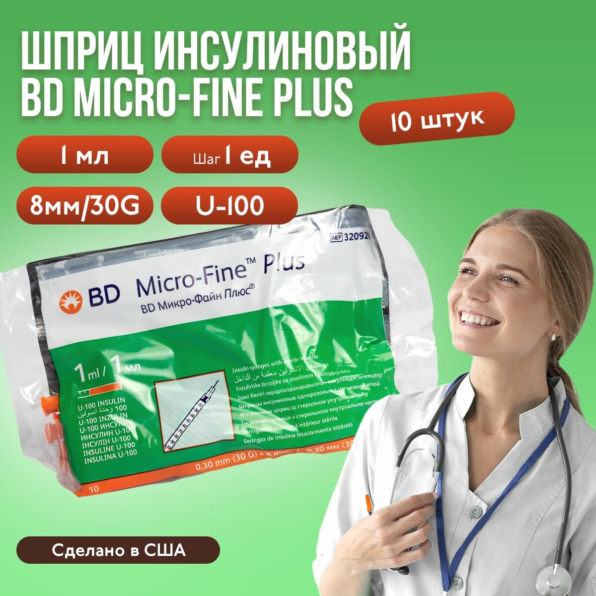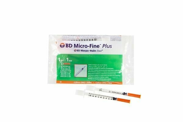 Шприц инсулиновый BD Micro-Fine Plus, 1 мл, шаг 1 ед, U-100, 30G (0,3 x 8 мм), 10 шт, медицинский