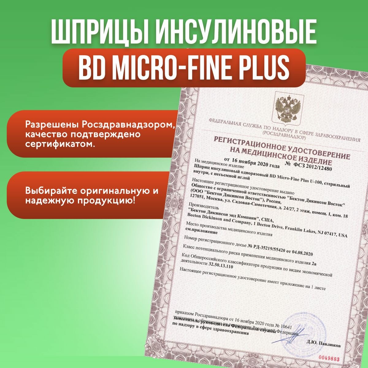 Шприц инсулиновый BD Micro-Fine Plus, 1 мл, шаг 1 ед, U-100, 30G (0,3 x 8 мм), 100 шт, медицинский