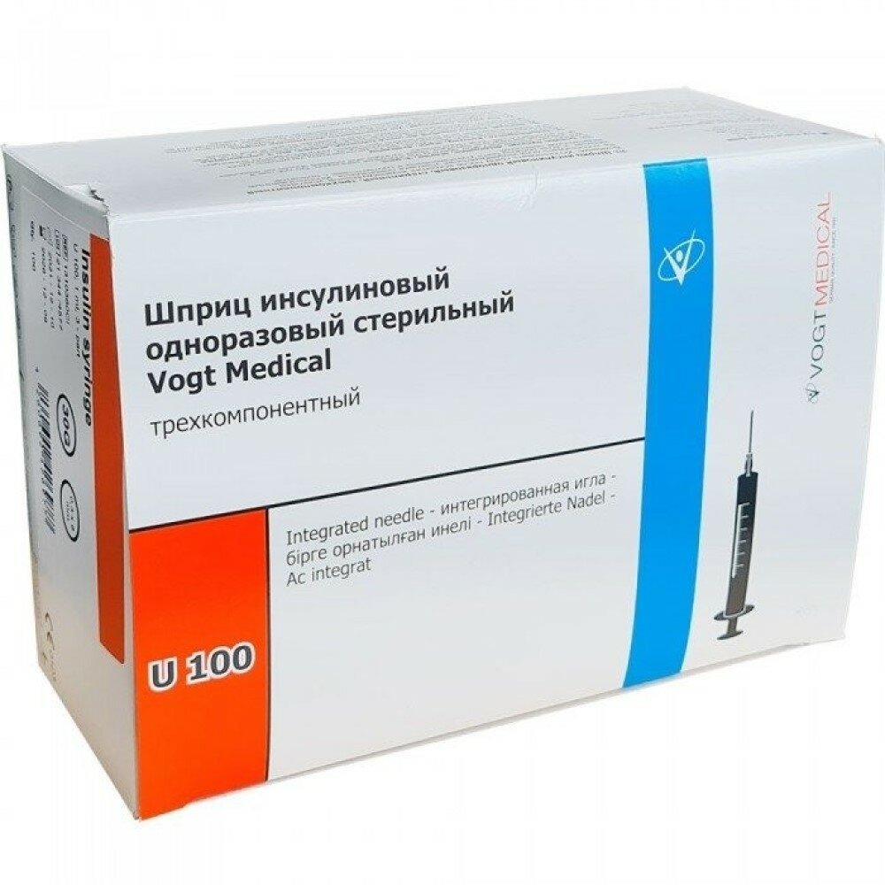 Инсулиновый шприц 1 мл с интегрированной иглой U100 30G 0,3 x 8 мм, Vogt Medical, Германия, 100 штук