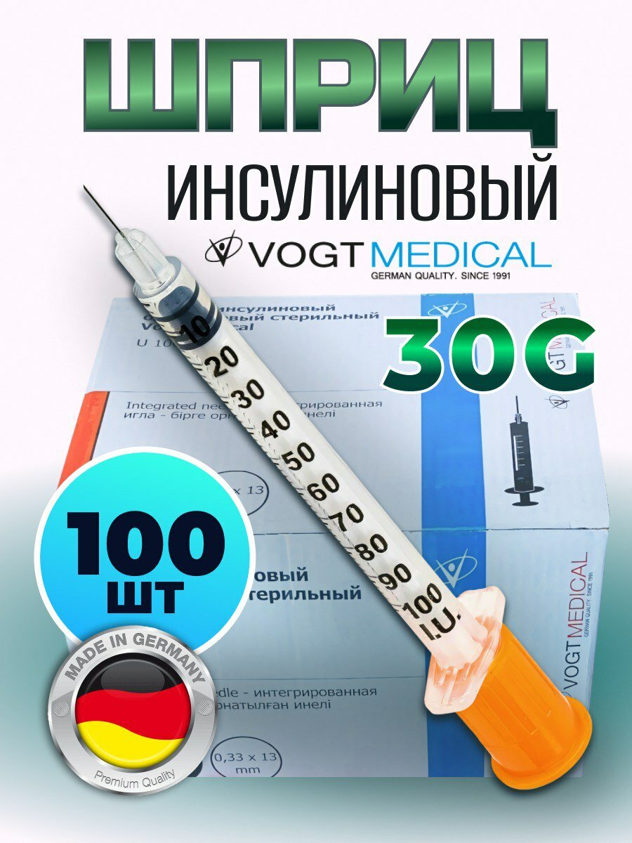 Инсулиновый шприц 1 мл с интегрированной иглой U100 30G 0,3 x 8 мм, Vogt Medical, Германия, 100 штук