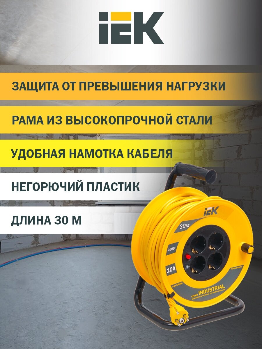 Удлинитель на катушке IEK Industrial УК30, 4 розетки, с т/з, с заземлением, 3 x 1 мм², 30 м