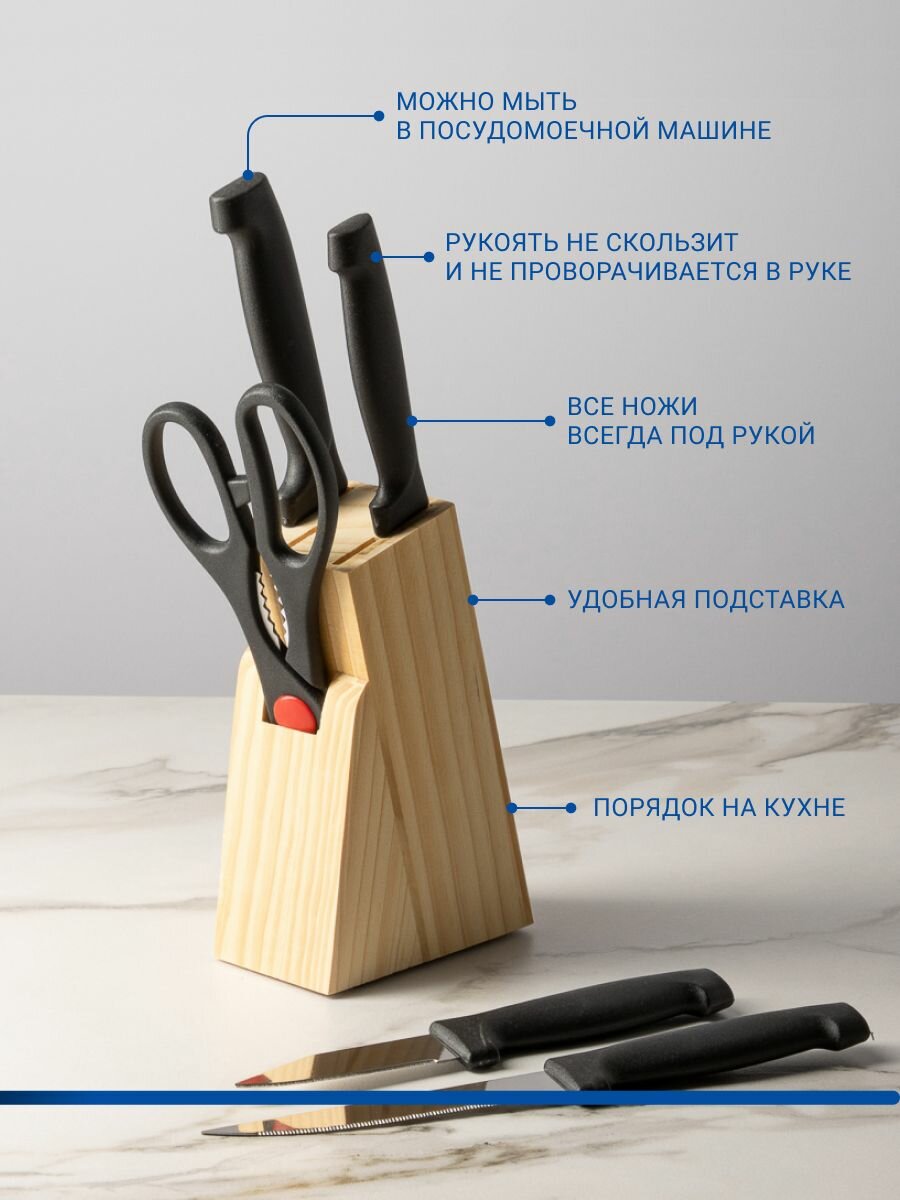 Набор ножей 6 пр. в дер.подставке: ножи кух. 7,5см, 11,5см, 12см, 14см, ножницы