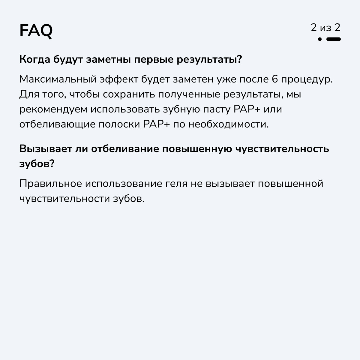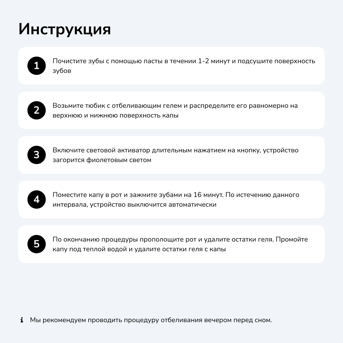 | Способ применения | 1. Почистите зубы с помощью пасты в течение 1-2 минут и подсушите поверхность зубов. 2. Возьмите тюбик с отбеливающим гелем и распределите его равномерно на верхнюю и нижнюю поверхности каппы. 3. Включите световой активатор длительным нажатием на кнопку, устройство загорится фиолетовым светом. 4. Поместите каппу в рот и зажмите зубами на 16 минут. По истечении данного интервала, устройство выключится автоматически. 5. По окончанию процедуры прополощите рот и удалите остатки геля. Промойте каппу под теплой водой и удалите остатки геля с каппы. |