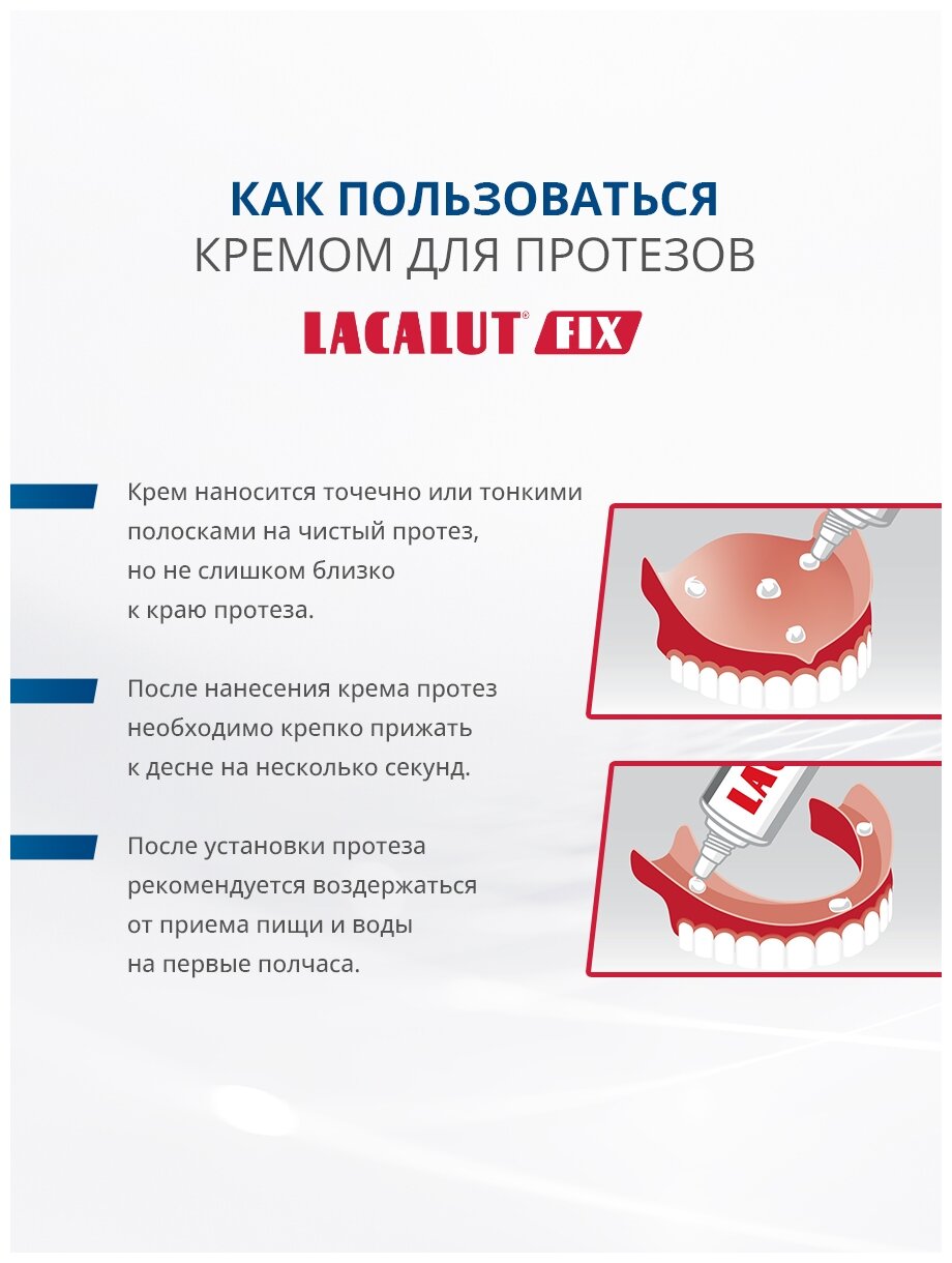 | Способ применения | крем наносится точечно или тонкими полосками на чистый протез, но не слишком близко к краю протеза. После нанесения крема протез необходимо крепко прижать к десне на несколько секунд. После установки протеза рекомендуется воздержаться от приема пищи и воды на первые полчаса. После применения плотно закройте крышку тюбика, чтобы крем не засох |