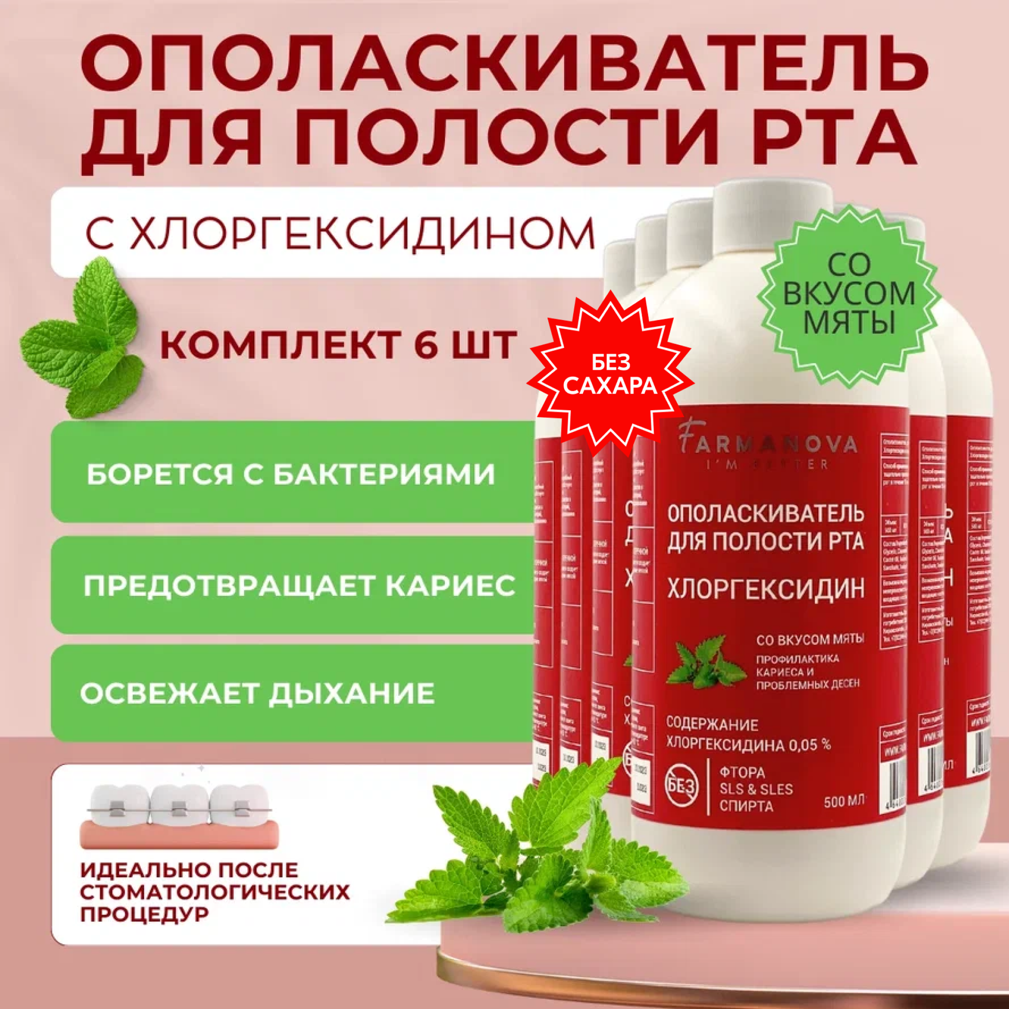 Купить 500 мл х 6 шт. Ополаскиватель для полости рта хлоргексидин 500 мл х 6 шт со вкусом мяты / Ополаскиватель / Для полости рта
