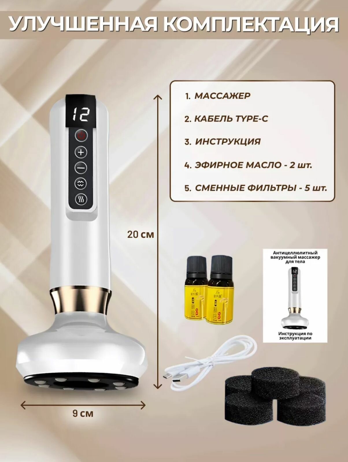 | Подробная комплектация | Массажер, масло - 2шт, сменные фильтры, кабель Type-C, инструкция |