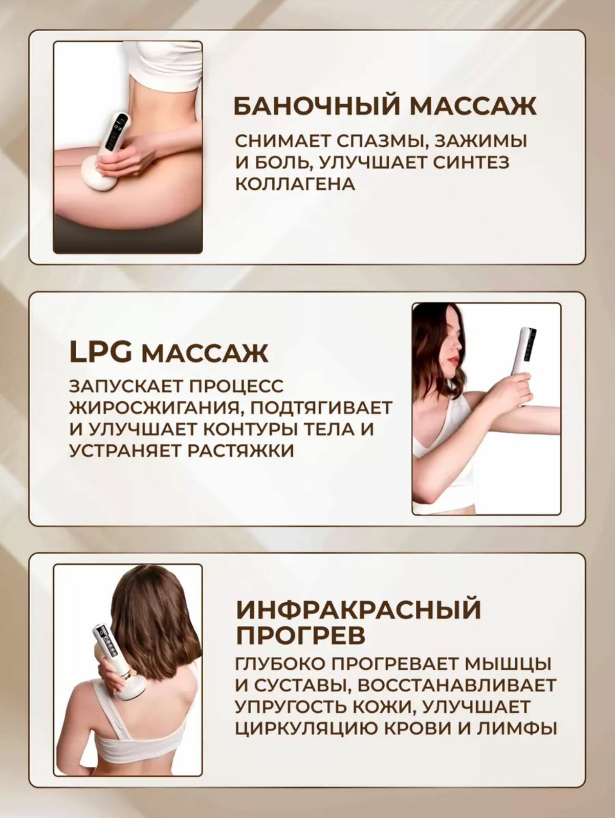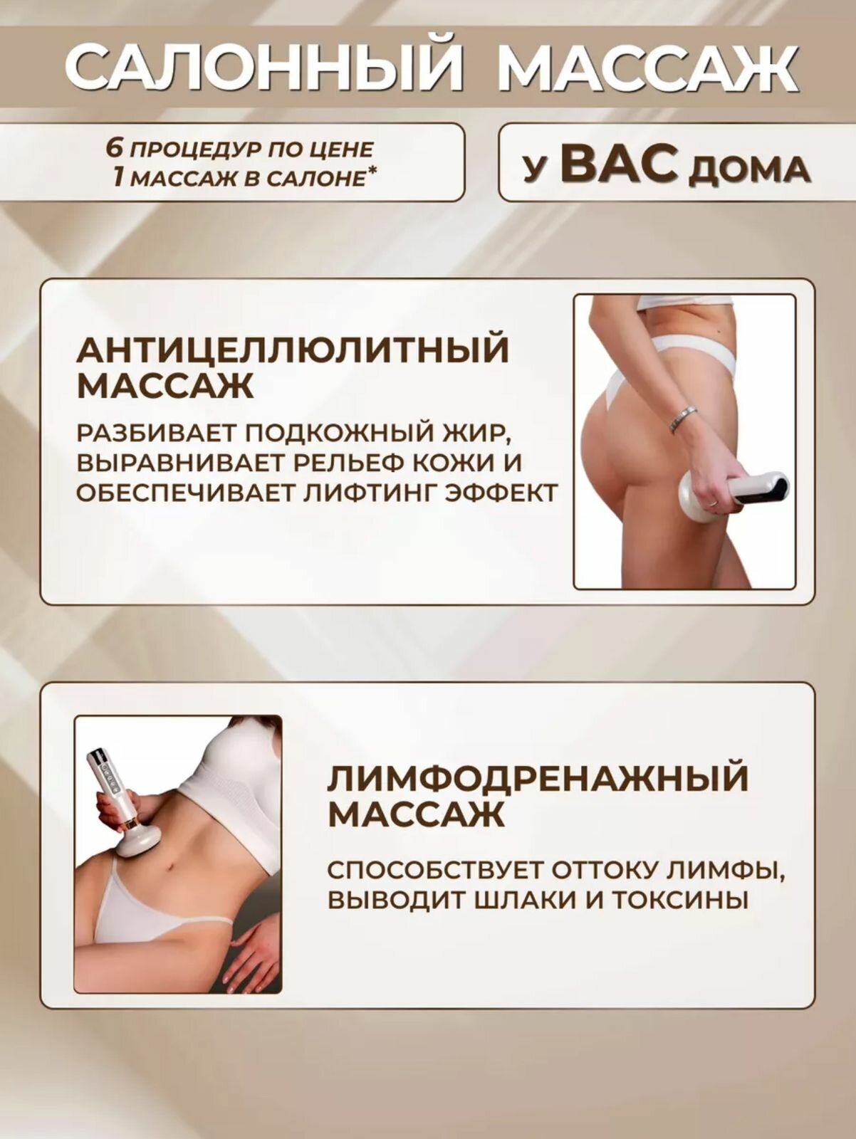 | Вид массажа | Шиацу / вакуумный / комбинированный / лимфодренажный / механический / расслабляющий / роликовый |